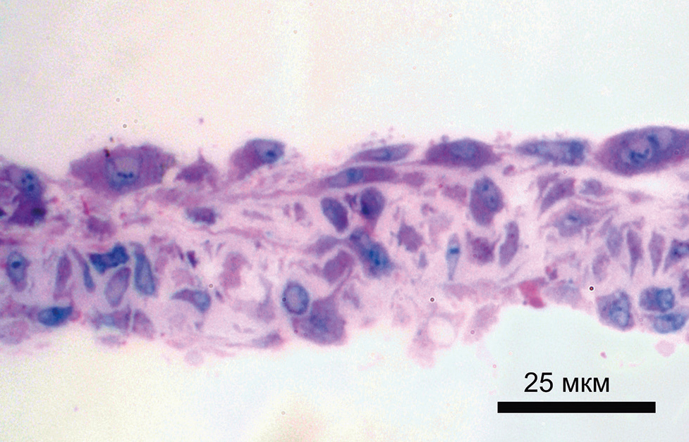 Изготовить срезы для оценки морфологических особенностей клеточного пласта, выращенного таким образом, можно было, только сняв его с подложки. Для этого после недели культивирования клеточный пласт отделяли от пластика путем тракции. При анализе полученных срезов методами световой (рис. 2, a) и электронной микроскопии (рис. 2, b) видно, что клеточный пласт представлен несколькими слоями кератоцитов.