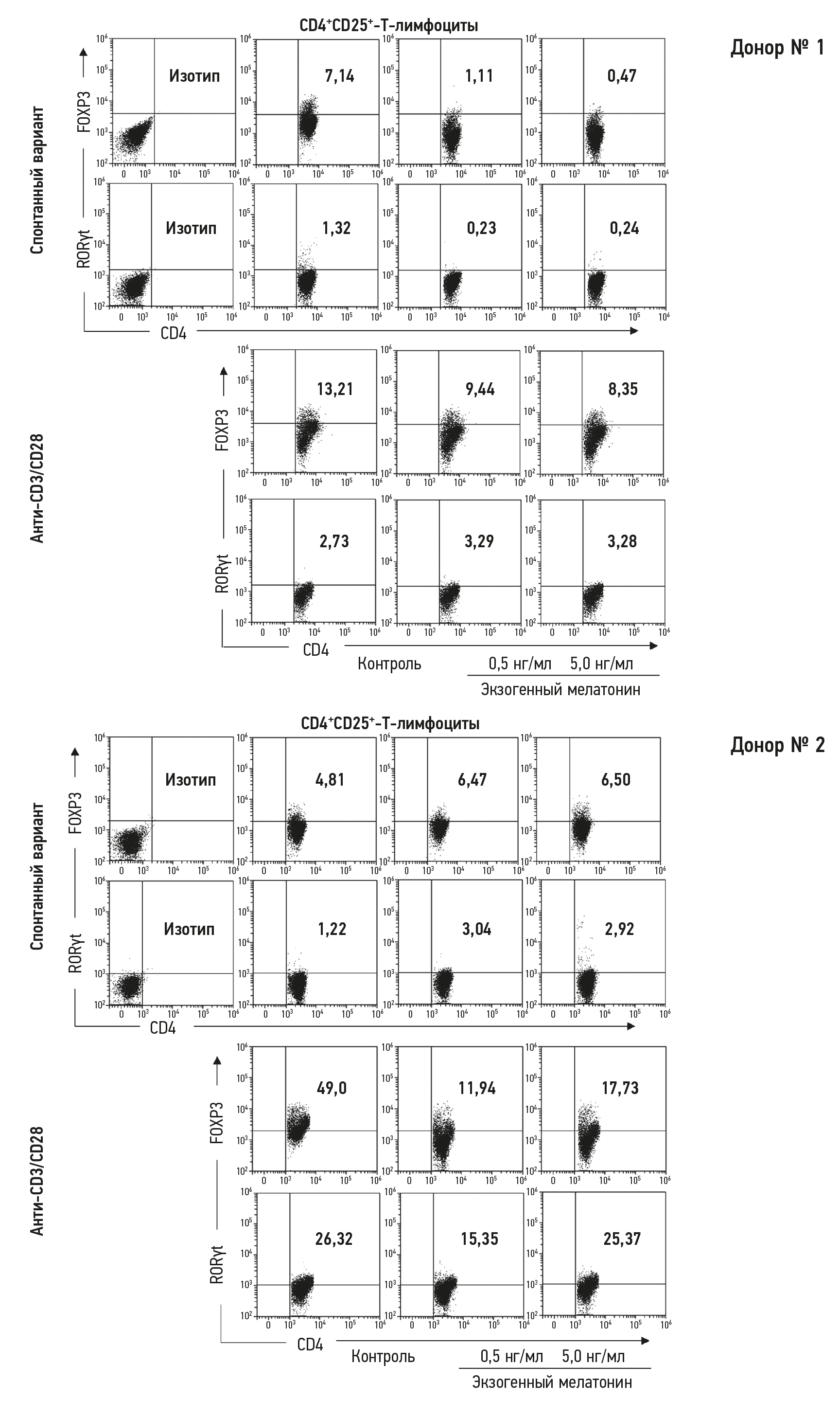 Важно отметить, что в культуре интактных Т-лимфоцитов мелатонин в фармакологической концентрации 0,5 нг/мл существенно увеличивал количество CD4+-T-клеток, одновременно синтезирующих маркёры как Treg (FOXP3), так и Th17 (RORγt) (см. табл. 1, рис. 2).