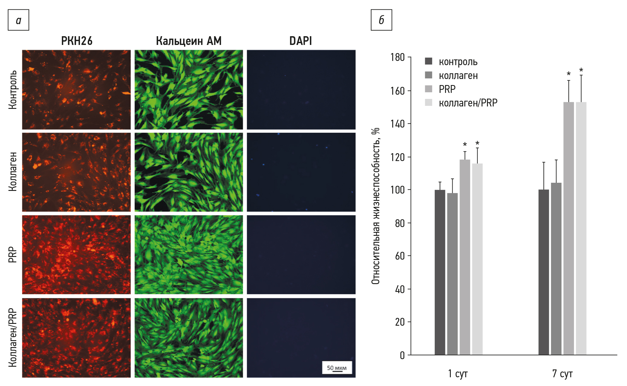 Рис. 1. Оценка цитотоксичности матрикса коллаген/PRP и его компонентов на культуре мультипотентных мезенхимальных стромальных клеток: а — окрашенных PKH26 (красный цвет); живых клеток, окрашенных кальцеином AM (зелёный цвет); мёртвых клеток, окрашенных DAPI (синий цвет). Флуоресцентная микроскопия: б — относительная жизнеспособность мультипотентных мезенхимальных стромальных клеток, МТТ-тест. * p <0,05 (по сравнению с контролем).