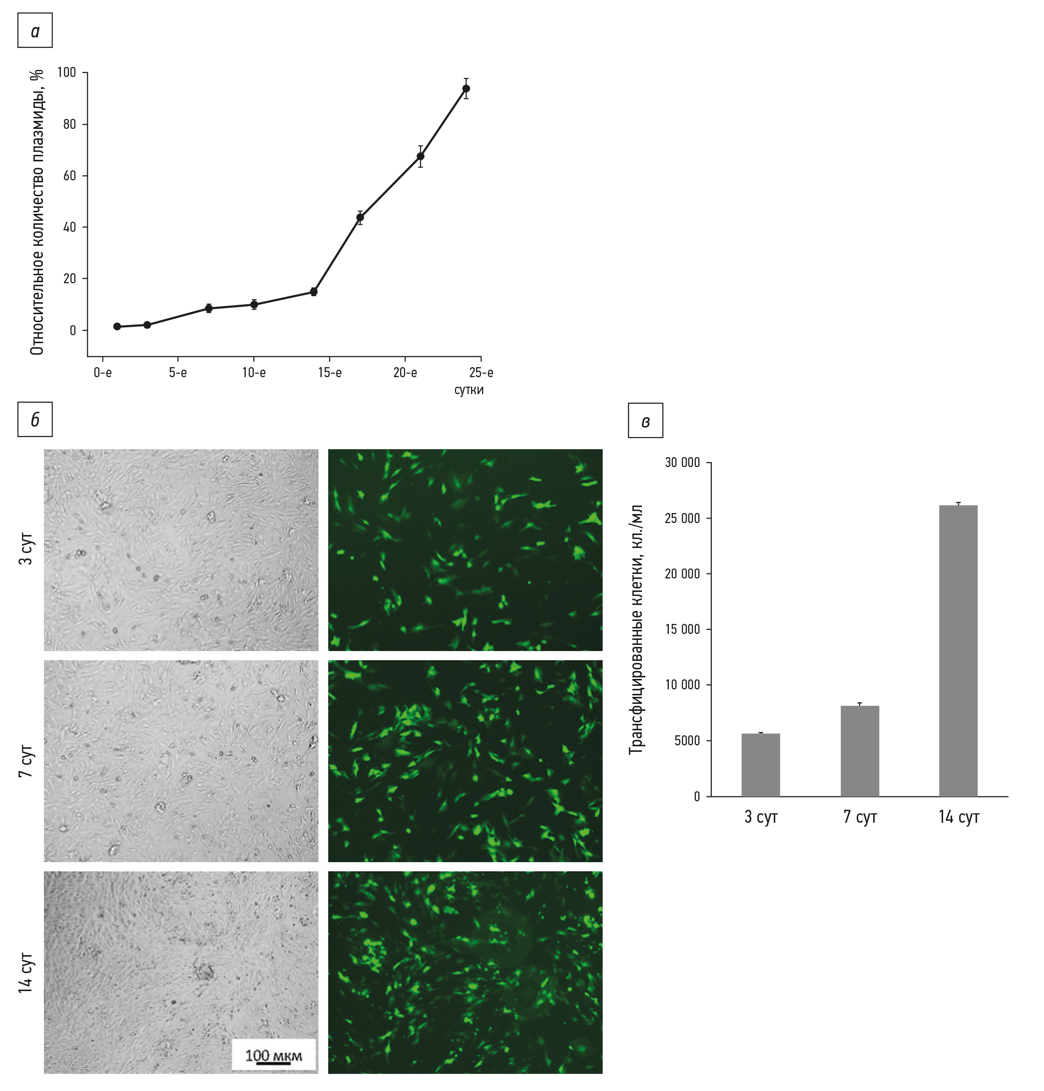 Для оценки трансфицирующей способности матриксы импрегнировали полиплексами TF/pEGFP и обнаружили, что включение плазмидных конструкций в гидрогелевые матриксы на основе коллаген/PRP обеспечивает их пролонгированное высвобождение (рис. 2, а). Плазмидные ДНК высвобождались постепенно: 20% выходило в первые 14 сут, а полное высвобождение происходило к 25 сут. Следует отметить, что полиплексы, высвободившиеся из матриксов, способны эффективно трансфицировать ММСК на протяжении всего исследуемого периода (рис. 2, б, в). По результатам проточной цитофлуориметрии и флуоресцентной микроскопии показано, что через 14 сут количество трансфицированных клеток увеличилось в 4,7 раза по сравнению с 3 сут. При этом трансфицирующая способность полиплексов TF/pEGFP, импрегнированных в матрикс, сопоставима по количеству трансфицированных клеток с полиплексами без скаффолдов для ММСК жировой ткани [16].