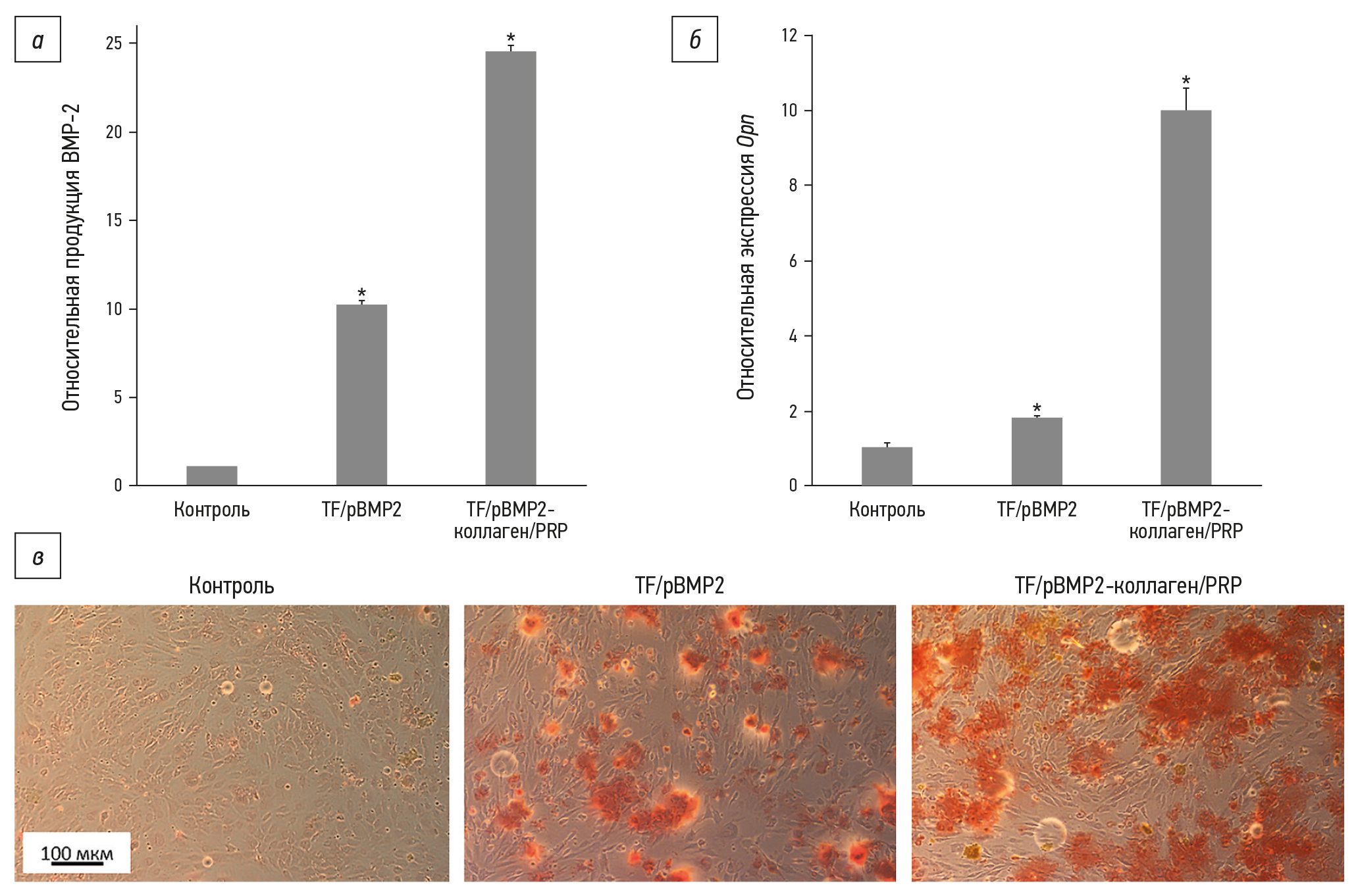 Рис. 3. Оценка остеогенных свойств матриксов TF/pBMP2-коллаген/PRP через 21 сут инкубации с мультипотентными мезенхимальными стромальными клетками: a — уровень продукции BMP-2, иммуноферментный анализ; б — уровень экспресcии гена Opn, ПЦР в режиме реального времени; * p <0,05 (по сравнению с контролем); в — минерализация внеклеточного матрикса мультипотентных мезенхимальных стромальных клеток, окрашивание ализариновым красным.