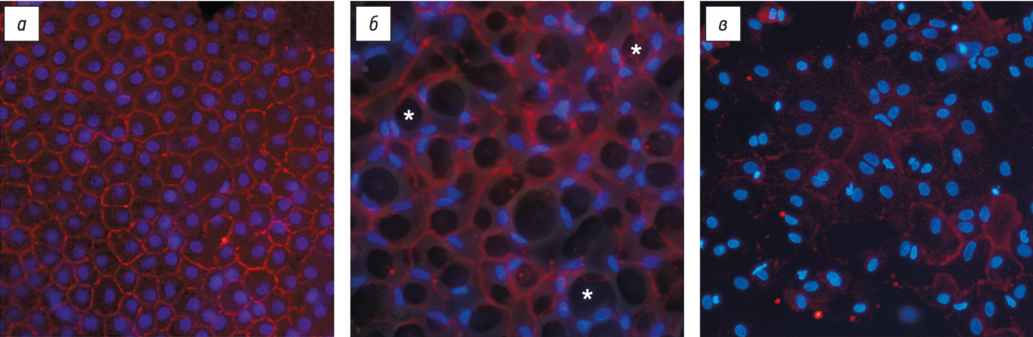 Рис. 3. Эндотелий и десцеметова мембрана: a — в условиях физиологической нормы, контроль; б — при эндотелиальной дистрофии роговицы Фукса; в — при псевдофакичной буллёзной кератопатии. Съёмка в режиме детекции флуоресценции (межклеточные контакты окрашены в красный цвет, ядра — в синий цвет) и фазового контраста (гутты отмечены белыми звёздочками); ×200.