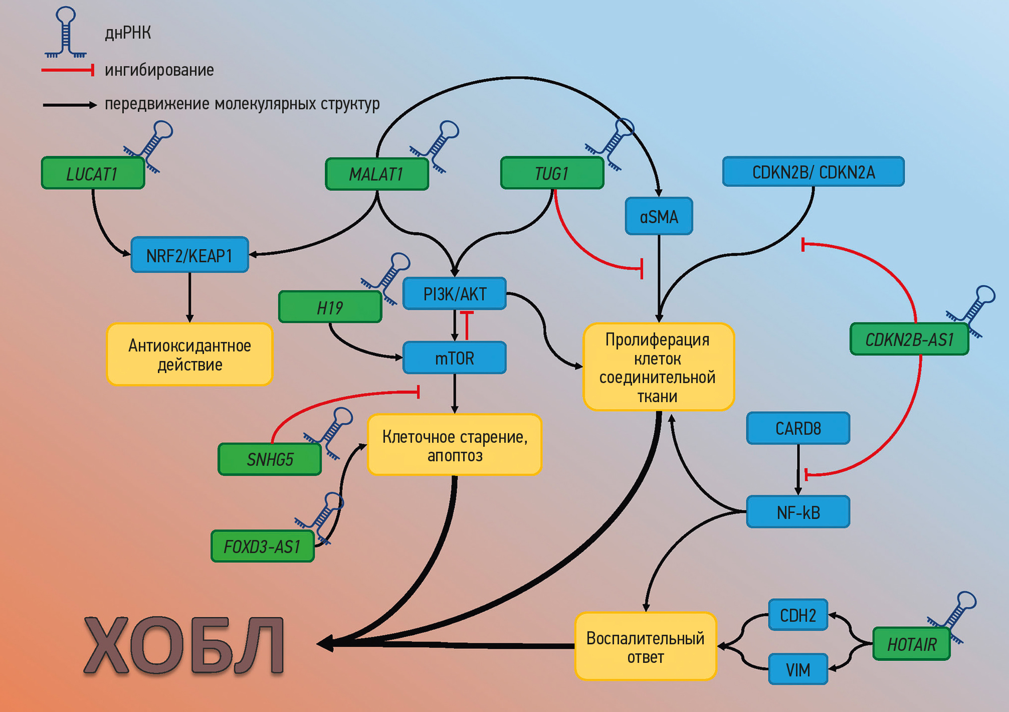 Fig. 2. Long non-coding RNAs (lncRNA) (detailed information is given in the table) and mechanisms of their involvement in the pathogenesis of chronic obstructive pulmonary disease (ХОБЛ). PI3K/AKT — phosphoinositide-3-kinase (PI3K) and AKT serine/threonine kinase 1 signaling pathway; mTOR — mechanistic target of rapamycin kinase; NRF2/KEAP1 — redox-sensitive system nuclear factor erythroid 2-related factor 2/Kelch like ECH associated protein 1 signaling pathway; NF-κB — nuclear factor kappa B; CDKN2B-CDKN2A — cyclin dependent kinase inhibitor 2A/B; αSMA — alpha smooth muscle actin; CARD8 — caspase recruitment domain family member 8; CDH2 — cadherin 2; VIM — vimentin. Black arrows — positive feed-forward/activation, red arrows — negative feed-forward/inhibition.