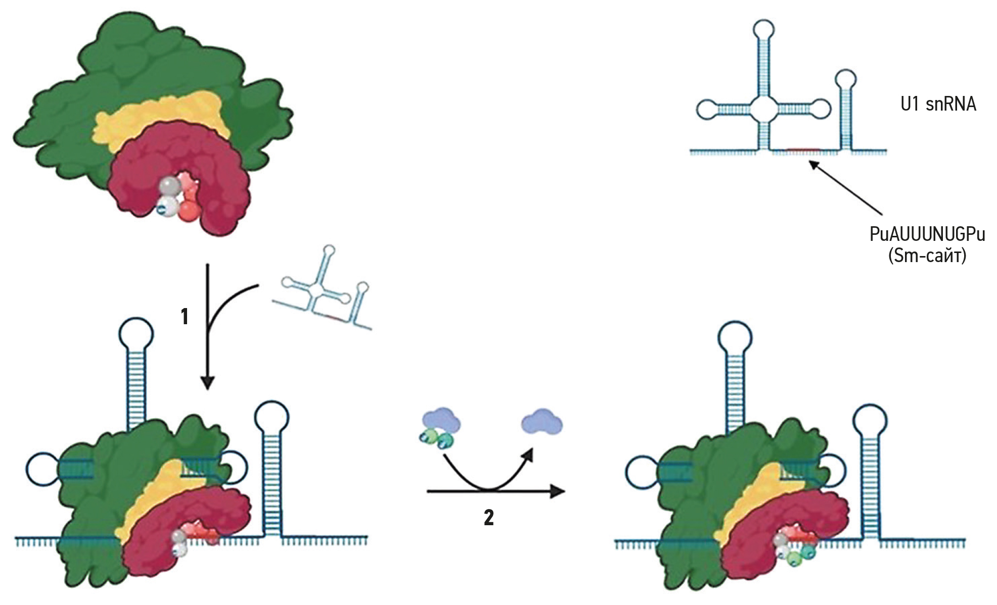 Белок Gemin2 стягивает пентамерное кольцо Sm D1(met)/D2/F/E/G, что мешает взаимодействию с нецелевыми snRNA [14]. Только взаимодействие комплекса SMN со специфичной вторичной структурой snRNA и связывание пентамера Sm D1(met)/D2/F/E/G с PuAUUUNUGPu (cпецифичный сайт связывания Sm белков с snRNA) приводит к уменьшению стягивания пентамера Sm D1(met)/D2/F/E/G и присоединению SmD3(met)/B(met) для завершения сборки комплекса snRNP [12–19]. В результате снижения уровня белка SMN уменьшается общее количество комплексов snRNP и, как следствие, это приводит к нарушению сплайсинга.
