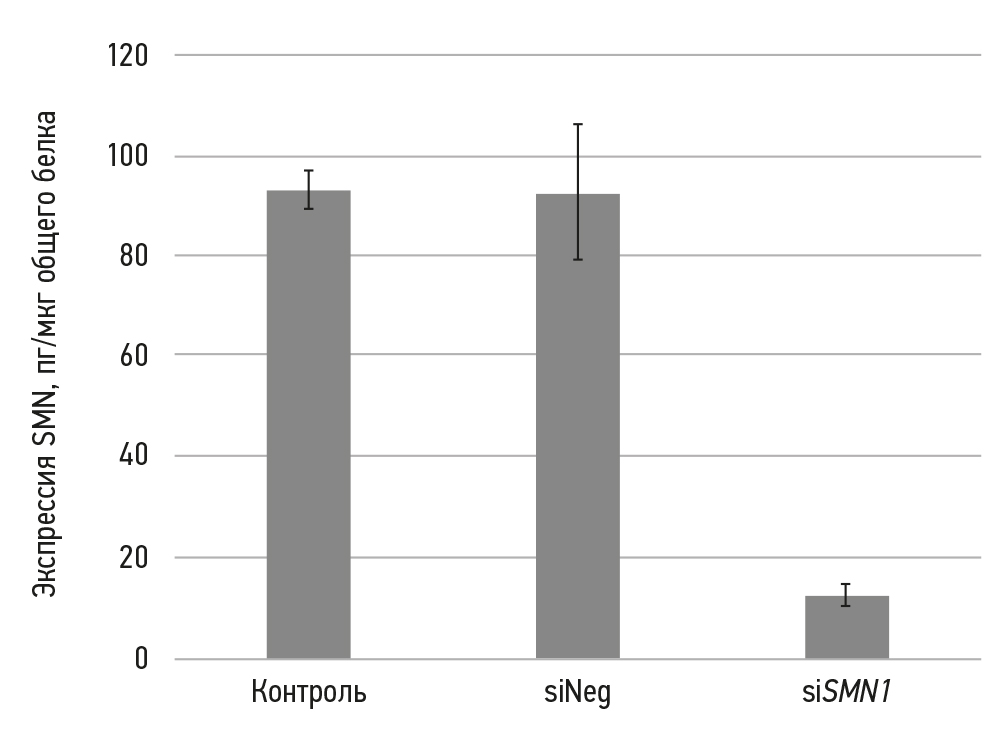 В результате проведения нокдауна гена SMN1 уровень белка SMN снижался более чем в 7 раз по сравнению с контрольными нетрансфицированными клетками. Для демонстрации специфичности siSMN1 использовали контрольную малую интерферирующую РНК (siNeg), не приводящую к РНК-интерференции. Концентрация белка SMN не снижалась в клеточных лизатах с siNeg в сравнении с контрольными.