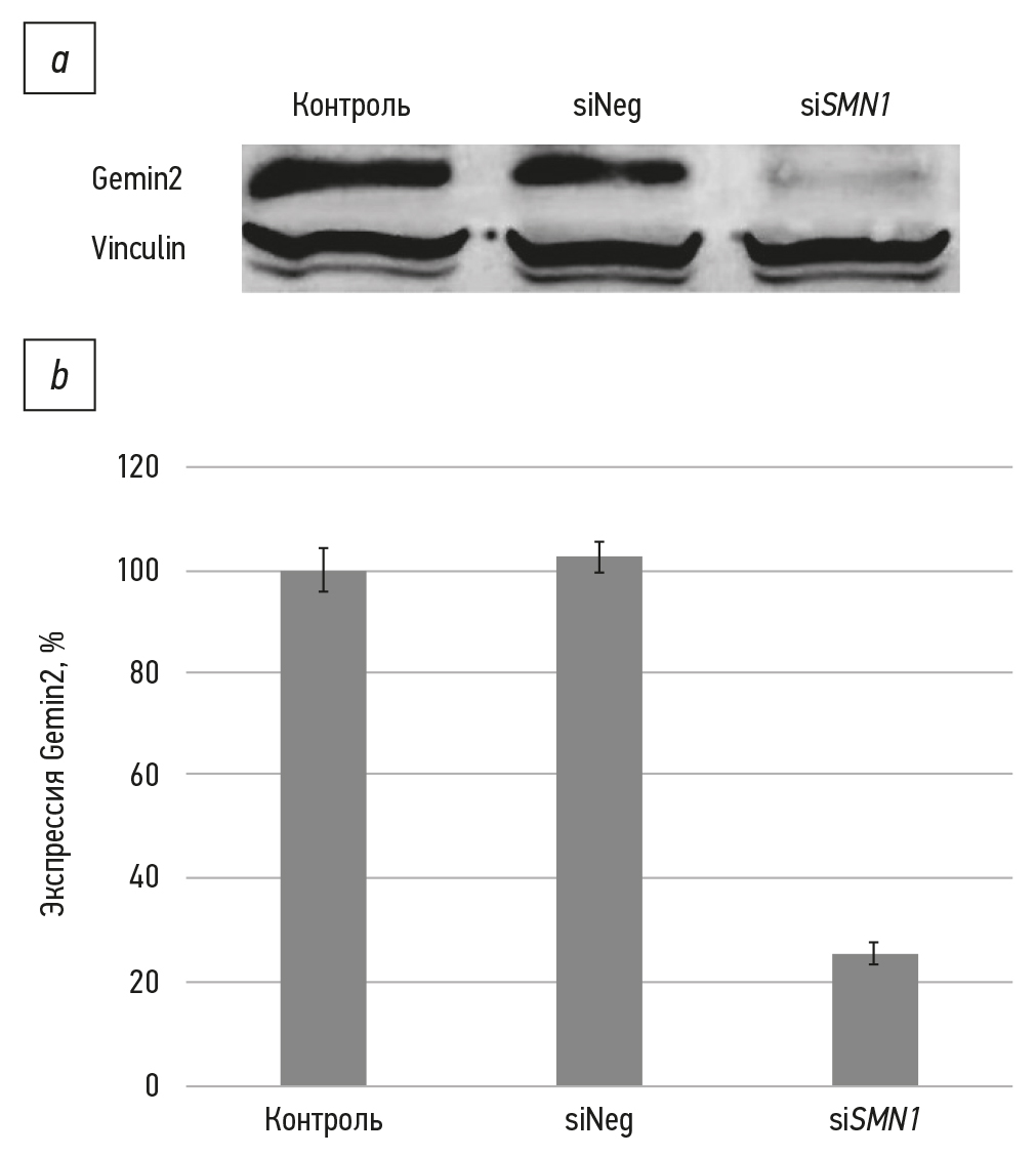 Рис. 3. Результаты оценки уровня белка Gemin2: a — контрастное изображение мембраны с проявленными белками Gemin2 и винкулин (Vinculin) после нокдауна SMN1; b — уровень Gemin2 после нокдауна SMN1 (гистограмма построена на основе данных, полученных после обработки блота в программе Image Studio Digits).