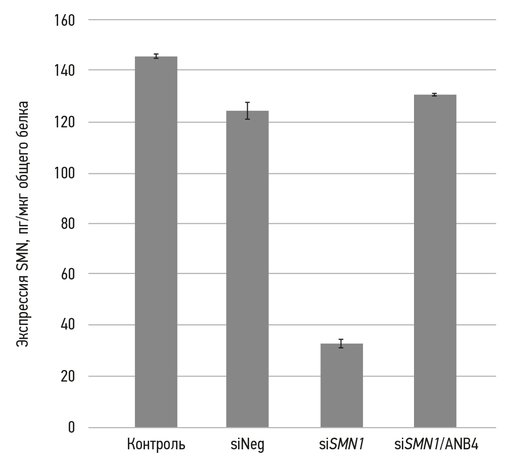 После инкубации с препаратом готовили клеточные лизаты и оценивали уровень белка SMN. Результаты репрезентативного эксперимента по оценке концентрации изучаемого белка после нокдауна SMN1 и трансдукции ANB4 представлены на рис. 4.
