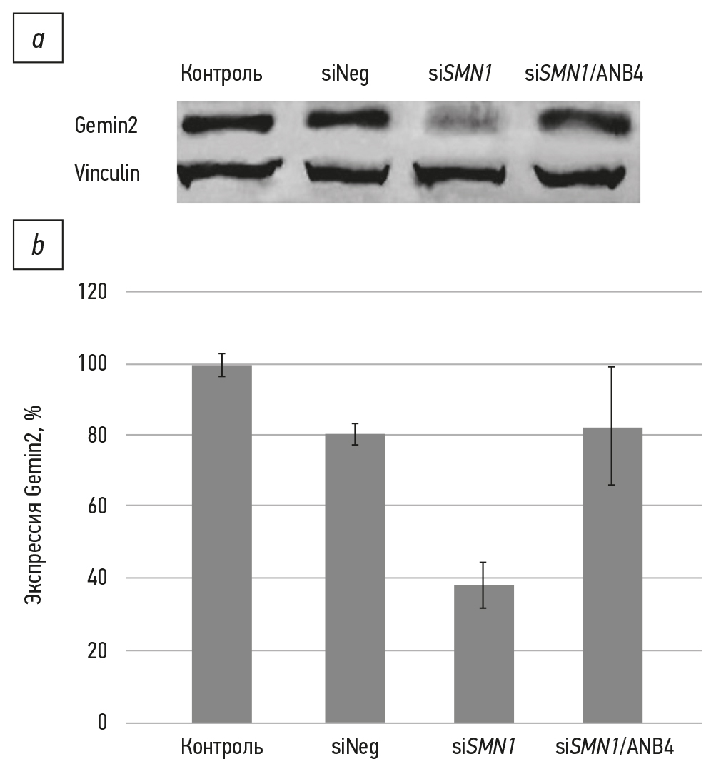 Рис. 5. Результат оценки функциональной активности ANB4: a — контрастное изображение мембраны с проявленными белками Gemin2, винкулин (Vinculin); b — гистограмма уровня белка Gemin2 клеточных лизатов HeLa после нокдауна SMN1 и трансдукции ANB4.