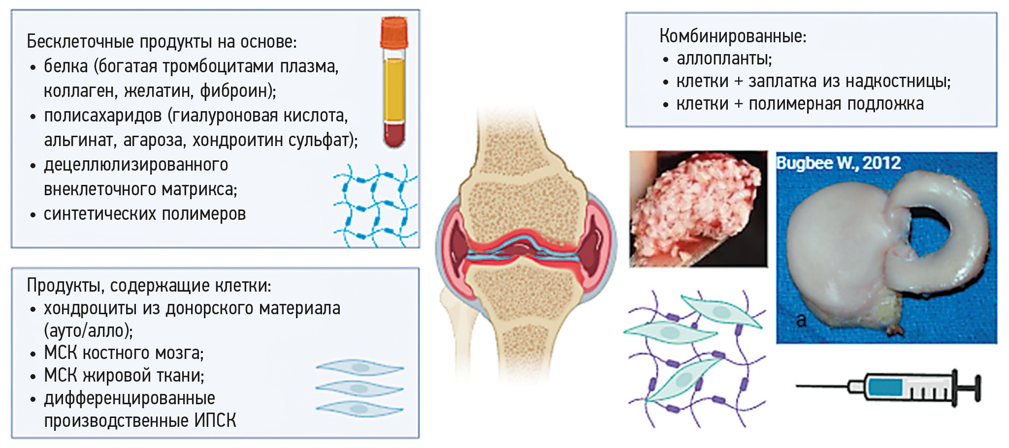 В течение последних десятилетий в клиническую практику было внедрено несколько методов восстановления хрящевой ткани, основанных на принципах регенеративной медицины с использованием многокомпонентных биомедицинских продуктов. К ним прежде всего относятся бесклеточные продукты, приготовленные из плазмы крови, а также содержащие полисахариды; ВКM, синтетические полимеры. В регенеративной терапии остеоартроза также используют биомедицинские клеточные продукты, содержащие хондроциты или МСК, которые могут вноситься внутрь сустава в виде клеточной суспензии или на носителе (рис. 1).