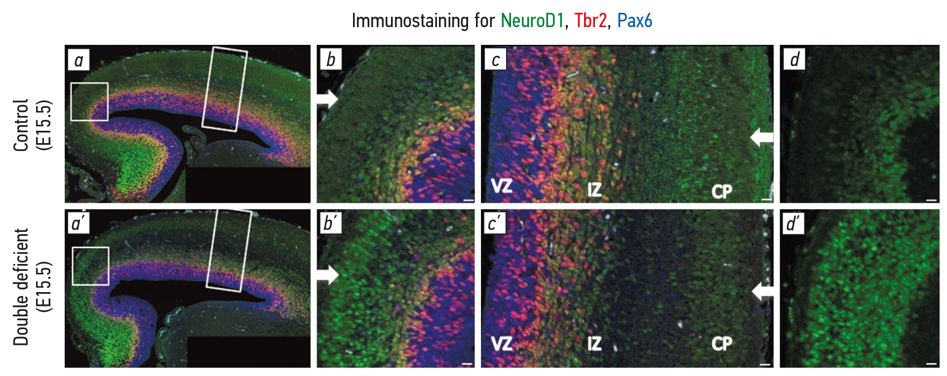 Fig. 1. Ectopic expression of NeuroD1 in the developing neocortex and hippocampus caused by inactivation of NeuroD2/6: a, a’ — immunofluorescent staining of NeuroD1 (green), Tbr2 (red), and Pax6 (blue); b, b’ — enlarged views of the areas in square frames; c, c’ — enlarged views of areas in rectangular frames; d, d’ — immunofluorescent staining for NeuroD1 (only green); note the lack of NeuroD1 expression in the wild type (d) and ectopic expression in the double deficient (d’). VZ — ventricular zone, IZ — intermediate zone, CP — cortical plate. Arrowheads indicate: b, c — area of the cortical plate in which NeuroD1 expression is absent; b’, c’ represents a similar region in cortical plate of double deficient that exhibits ectopic expression of NeuroD1. IF staining was performed on sections of E15.5 littermate control and double deficient brains. Scale bars: 10 µm.
