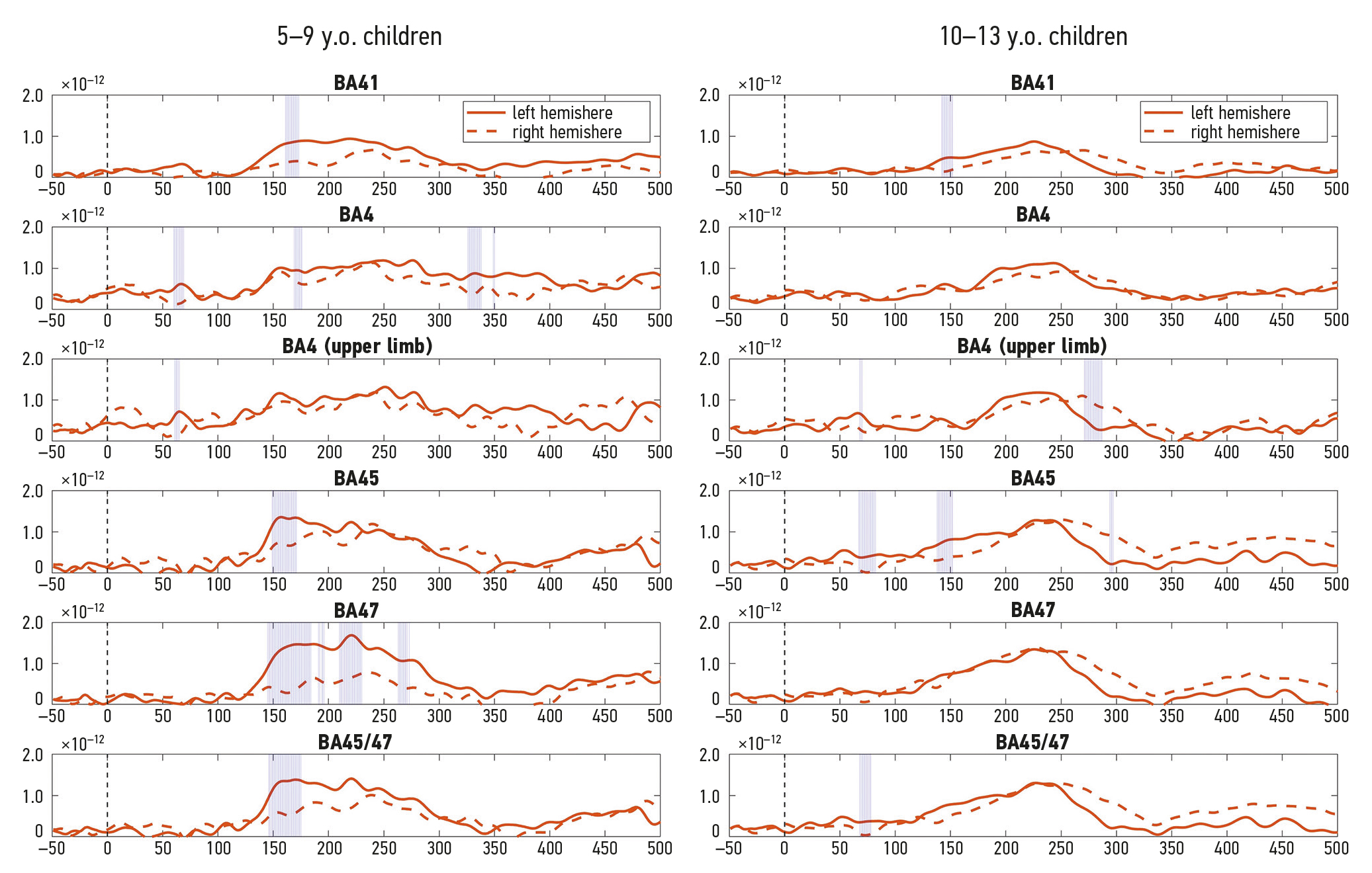 The MMNm source dynamics for the concrete action-related verb are shown in Fig. 1. The results of the pairwise permutation tests showed statistically significant magnitude differences between hemispheric sources only in the younger group (aged 5–9 years, Figure 1, left panel) and only for the upper-limb motor area within BA4 in 200 and 300 ms. No other differences were found when comparing ROIs between hemispheres in this group (including the full BA4). For the older group (aged 10–13 years, Fig. 1, right panel), the concrete-verb condition yielded a significantly left-lateralized response only in BA45 in the IFG around 130, 160, and 230 ms.