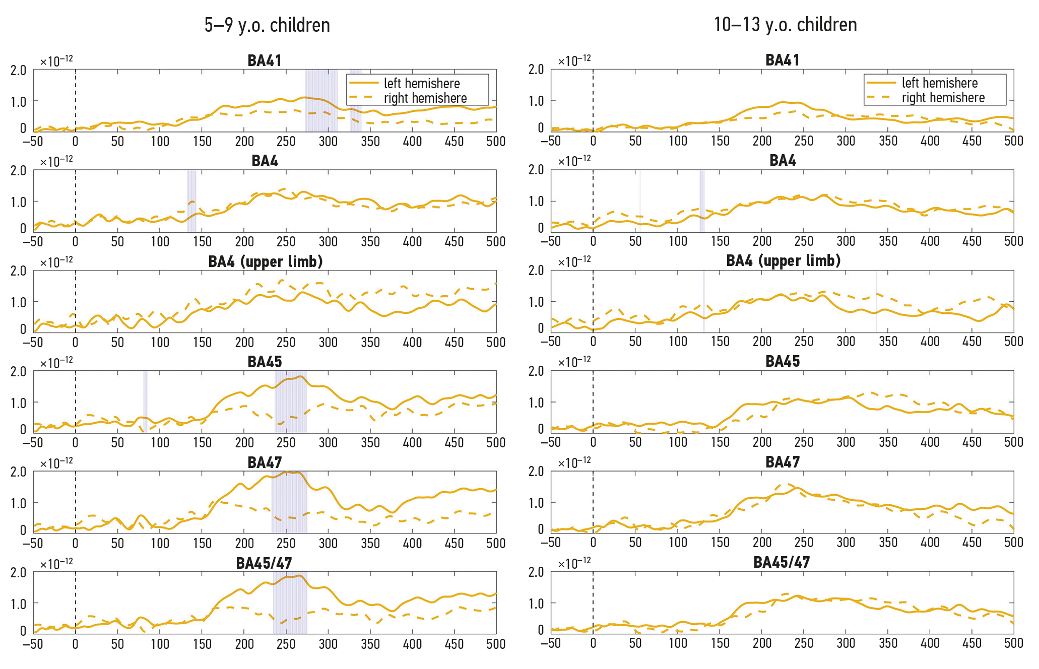 Рис. 3. Временн´ые ряды регионально-специфичных ответов негативности рассогласования на псевдослово в двух возрастных группах. Ось X (для всех графиков): время с момента точки дезмабигуации (начало второго слога, мс); ось Y (для всех графиков): сила источников магнитного поля (условные единицы, у.е.). Здесь: билатеральные области интереса: BA41, BA4 целиком, BA4 зона руки, BA45, BA47, BA45/47 вместе. Жирные линии соответствуют левополушарным ответам негативности рассогласования; пунктирные линии — правополушарным ответам негативности рассогласования; затенённые области графиков — моментам времени, к которых обнаружены статистически значимые различия (парный пермутационный тест, p <0,05) между ответами левого и правого полушарий.