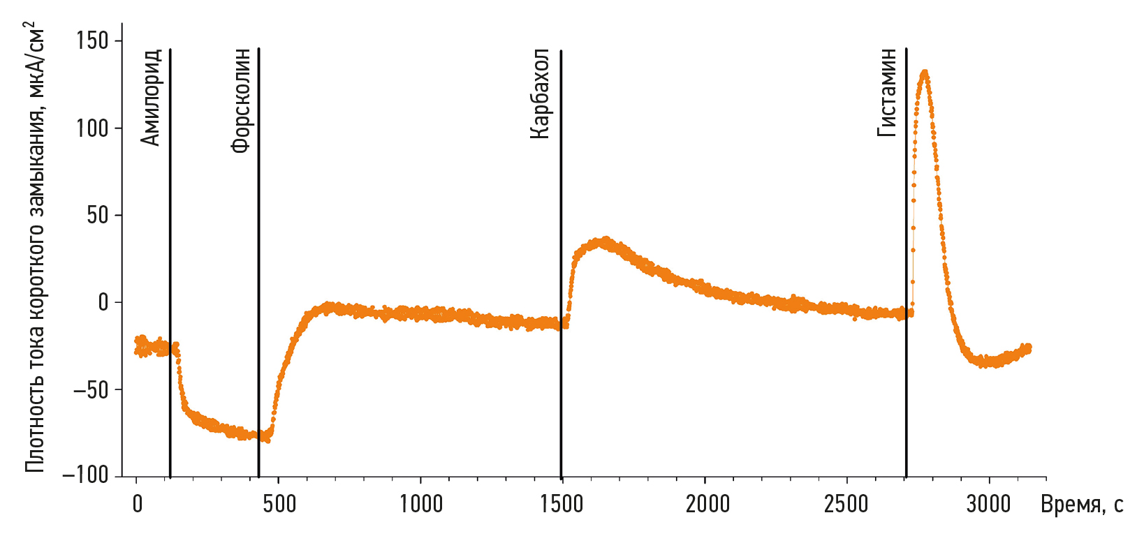 Рис. 2. Результаты измерения плотности тока короткого замыкания у здорового добровольца с функциональным CFTR-каналом (отрицательный контроль). При введении амилорида происходило снижение тока короткого замыкания, в ответ на форсколин — значительное увеличение ΔISC, а при добавлении карбахола и гистамина отмечено изменение тока короткого замыкания в положительную сторону
