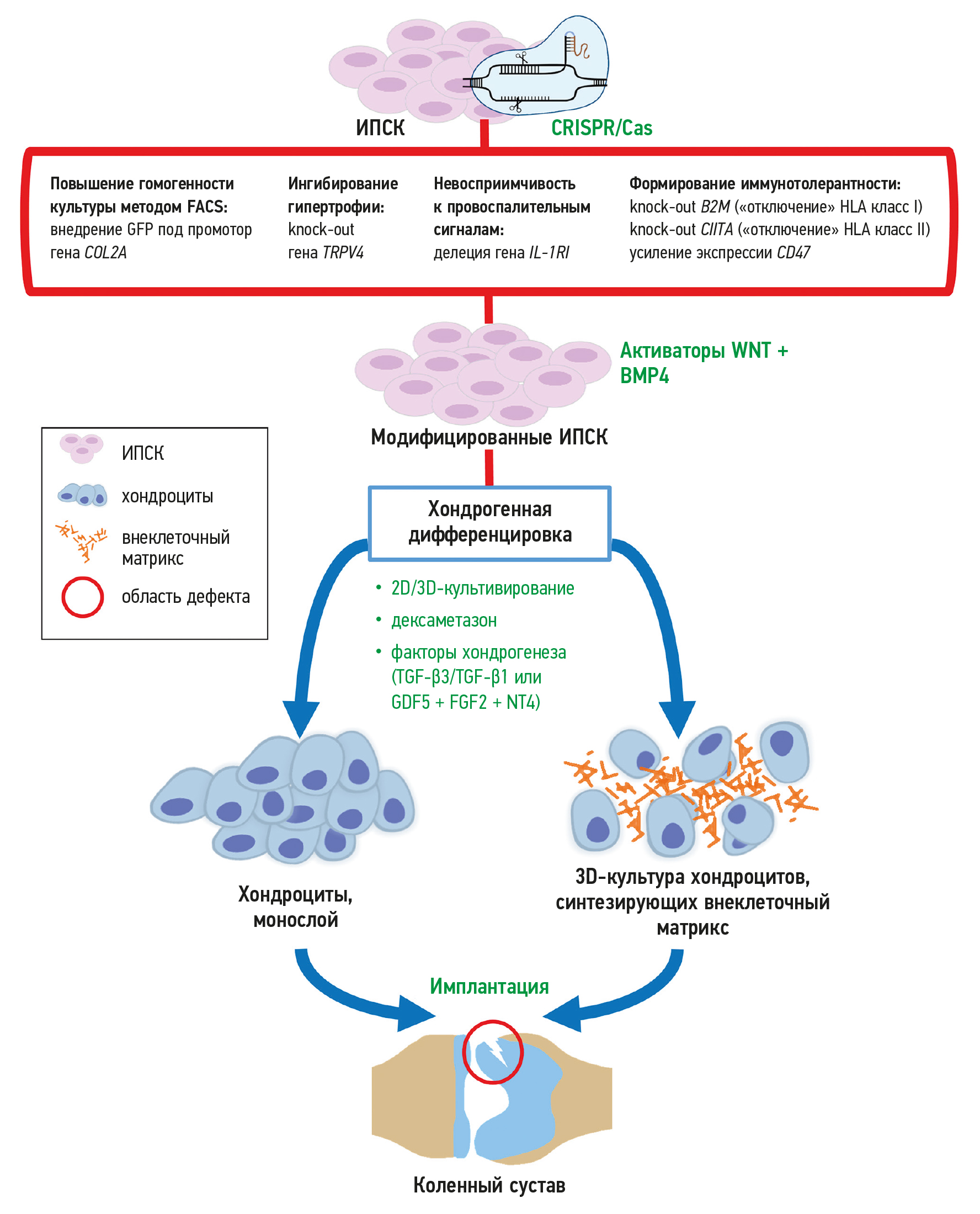 В настоящее время технологии в биомедицине развиваются стремительно. Технология получения линий ИПСК, содержащих требуемую генетическую модификацию, расширяет горизонты в области регенеративной и персонифицированной медицины. Модификация ИПСК позволяет решать сложные биологические задачи, связанные с аутологичной и аллогенной трансплантацией. Редактирование генома даёт возможность получать линии ИПСК, «склонные» к хондрогенной дифференцировке, либо линии ИПСК, способные при культивировании препятствовать формированию гипертрофированных хондроцитов из хондропрогениторов, что позволяет приблизиться к решению непосредственно прикладных медицинских задач, а также отыскать мишени, облегчающие и/или стимулирующие хондрогенез в условиях in vitro и впоследствии — in vivo.
