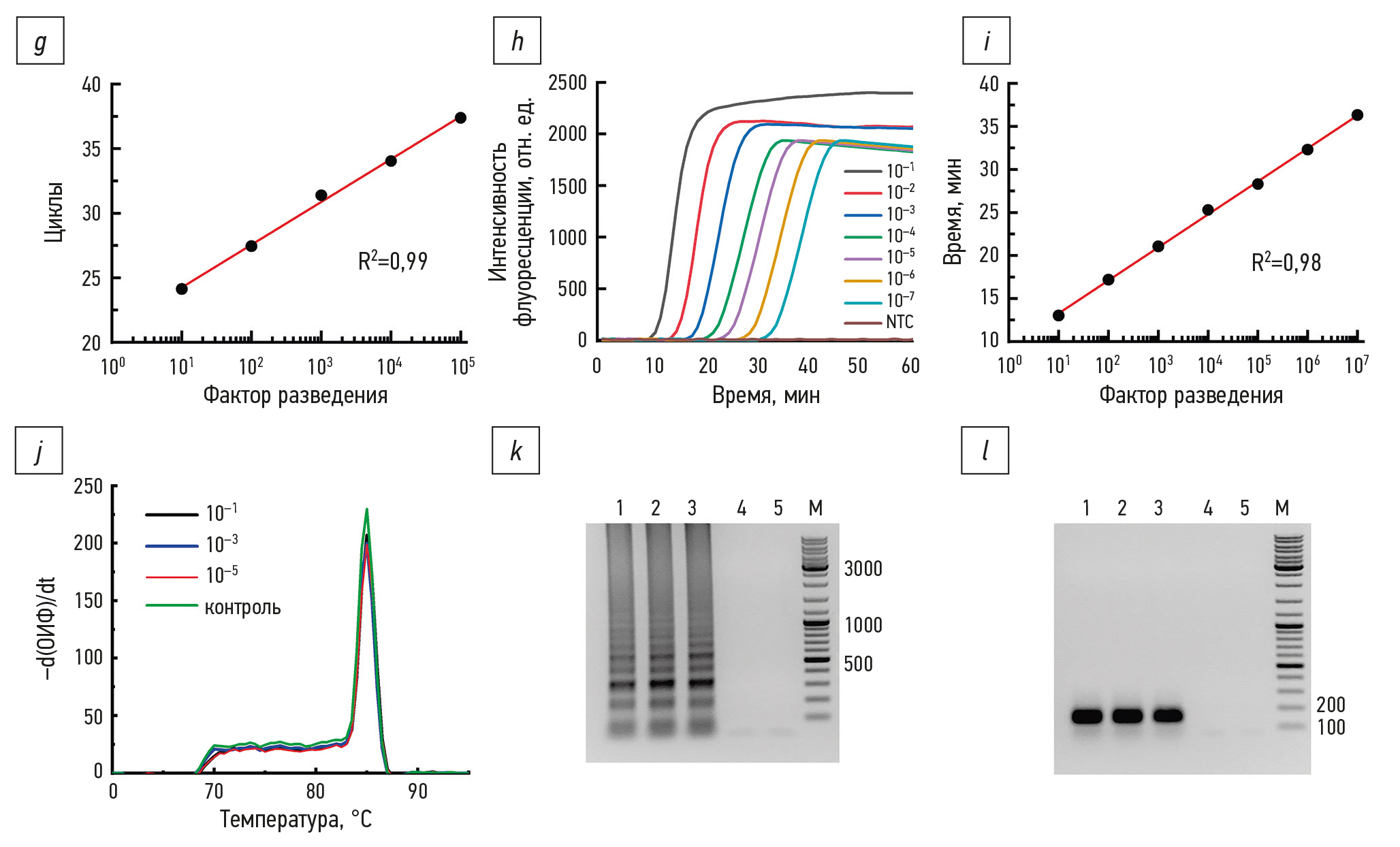 Рис. 2. Подбор оптимальных условий проведения реакций петлевой изотермической амплификации (LAMP) и количественной полимеразной цепной реакции (кПЦР): а — оценка влияния количества Bst-pol на значение порогового времени (краситель — 1X SYBR Green I); b — оценка влияния количества Bst-pol на значение порогового времени (краситель — LUCS13); c — оценка влияния количества красителя LUCS13 на форму кривой накопления сигнала; d — LAMP серии десятикратных разведений комплементарной ДНК (кДНК), полученной из суммарной РНК клеток Expi293, мишень — ген бета-актина; e — кПЦР серии десятикратных разведений кДНК, полученной из суммарной РНК клеток Expi293, мишень — ген бета-актина; f — кривые накопления сигнала кПЦР при анализе десятикратных разведений матрицы кДНК; g — график зависимости среднего значения порогового цикла от десятичного логарифма разведения матрицы при кПЦР; h — кривые накопления сигнала LAMP при анализе десятикратных разведений матрицы кДНК, краситель LUCS13 (2,5 мкМ); i — график зависимости среднего значения порогового цикла от десятичного логарифма разведения матрицы при LAMP; j — кривые плавления ПЦР-продуктов, полученных в ходе кПЦР, –d(ОИФ)/dt — производная флуоресценции по температуре, 10–1, 10–3, 10–5 — кривые плавления ПЦР-продуктов, индексы соответствуют фактору разведения кДНК, полученной из суммарной РНК клеток Expi293, контроль — кривая плавления для контрольного образца (в качестве матрицы использовали ПЦР-продукт, полученный с использованием пары праймеров ACTB-F/ACTB-R); k — электрофоретическое разделения продуктов амплификации в ходе LAMP; l — электрофоретическое разделения продуктов амплификации в ходе кПЦР. На рис. d, e: чёрные линии — краситель LUCS13 (2,5 мкМ), красные линии — краситель SYBR Green I; на рис. f, h: NTC — контроль без матрицы; на рис. g, i: R2 — коэффициент детерминации; на рис. k, l: 1 — контрольный образец (в качестве матрицы использовали ПЦР-продукт, полученный с использованием пары праймеров ACTB-F3/ACTB-B3); 2, 3 — ПЦР-продукты из разведений кДНК 10–1 и 10–5, полученной из суммарной РНК клеток Expi293; 4 — образец NRT, 5 — образец NTC; М — маркёр GeneRuller DNA LadderMix (Thermo Fisher Scientific, США), числами указана длина некоторых полос (п. н.).