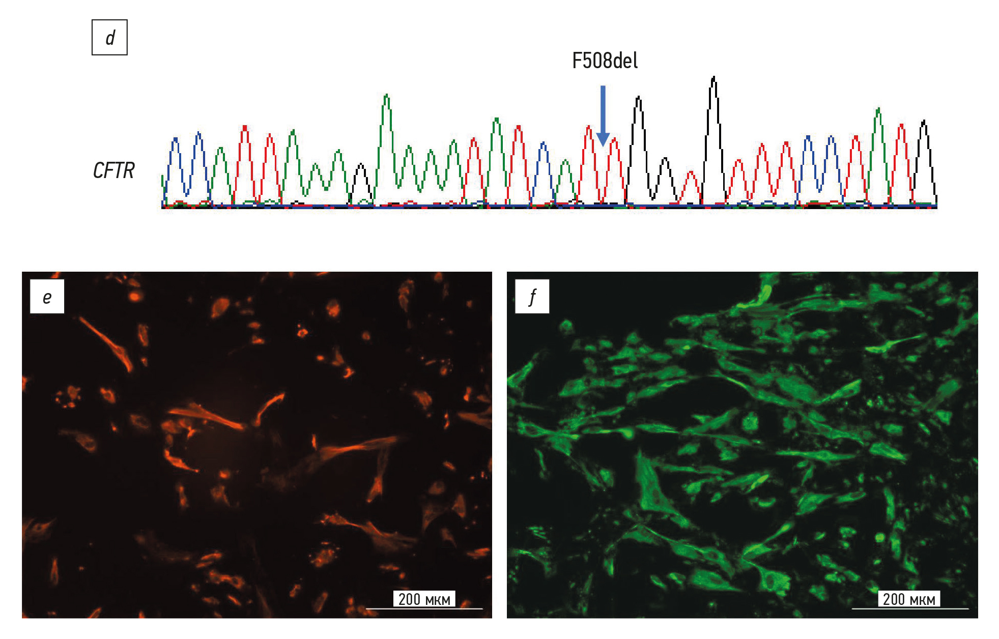 Рис. 3. Морфология и характеристика линии индуцированных плюрипотентных стволовых клеток человека P7L2: a — морфология колонии индуцированных плюрипотентных стволовых клеток; b — окраска индуцированных плюрипотентных стволовых клеток на маркёр плюрипотентности SOX2; c — кариотип линии индуцированных плюрипотентных стволовых клеток; d — секвенограмма локуса CFTR с мутацией F508del; e — иммуноцитохимическое окрашивание клеток на кератин-76; f — иммуноцитохимическое окрашивание клеток на виментин.