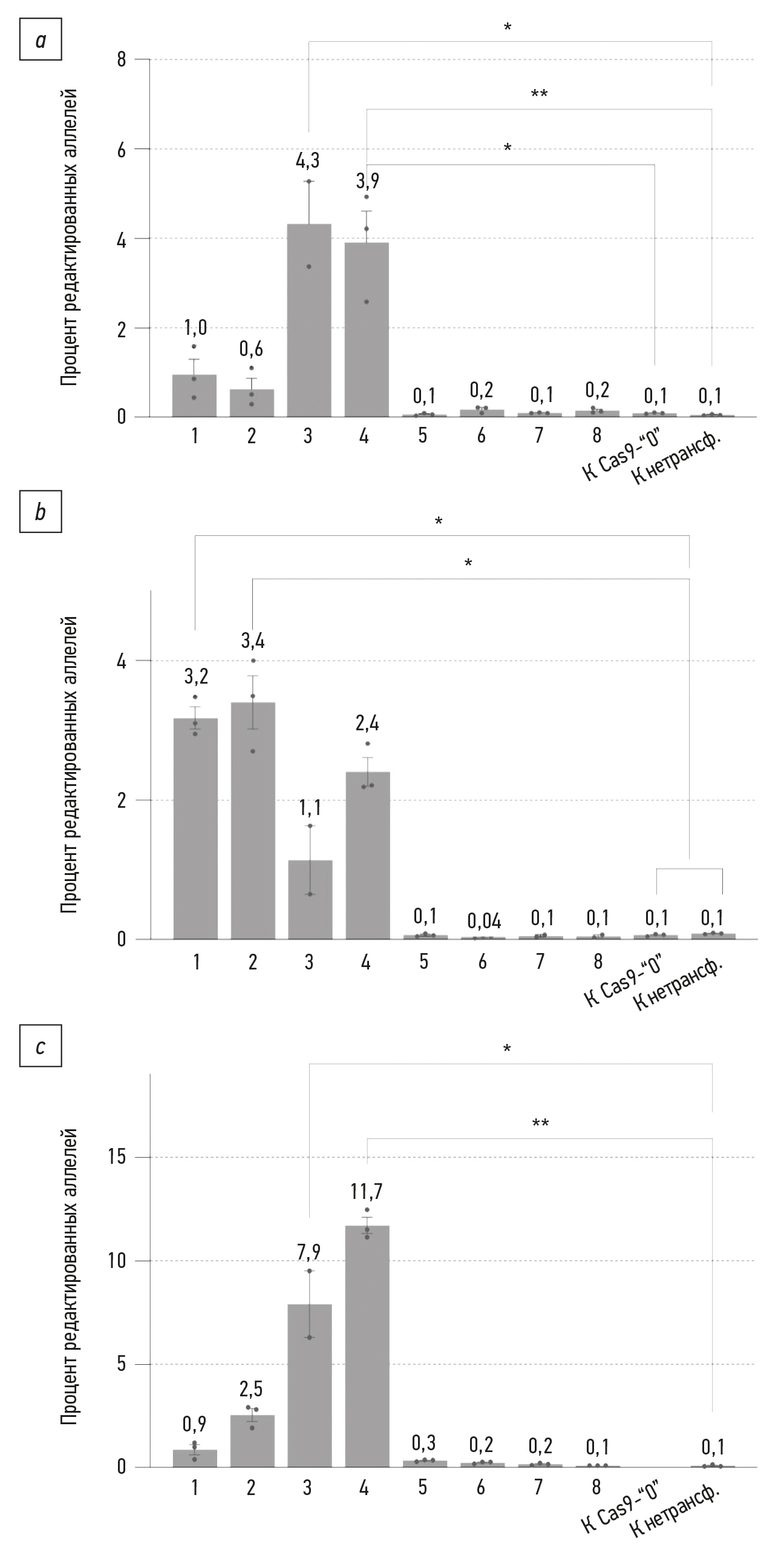 Fig. 10. Directed homologous repair levels in three human induced airway basal stem cells lines: a — P1L5 line, b — P2L2 line, c — P7L2 line. The numbers on the Y-axis correspond to the numbers of the editing systems in Table 3. “К нетрансф.” means the untransfected control. Mean ± SEM (n=3–6); * p <0.05; ** p <0.01.