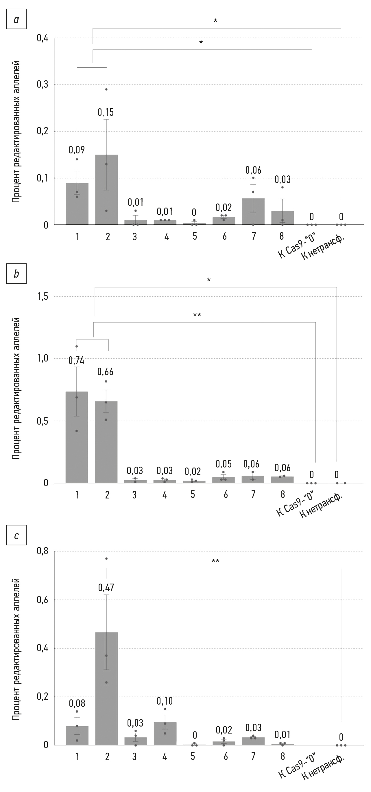 Fig. 5. Non-homologous end joining levels in three human induced pluripotent stem cells lines: a — P1L5 line, b — P2L2 line, c — P7L2 line. The numbers on the Y-axis correspond to the numbers of the editing systems in Table 3. K-Cas9-“0” means the negative editing control, a plasmid with “null” single guide RNA. “К нетрансф.” means the untransfected control. Mean ± SEM (n=3–6); * p <0.05; ** p <0.01.