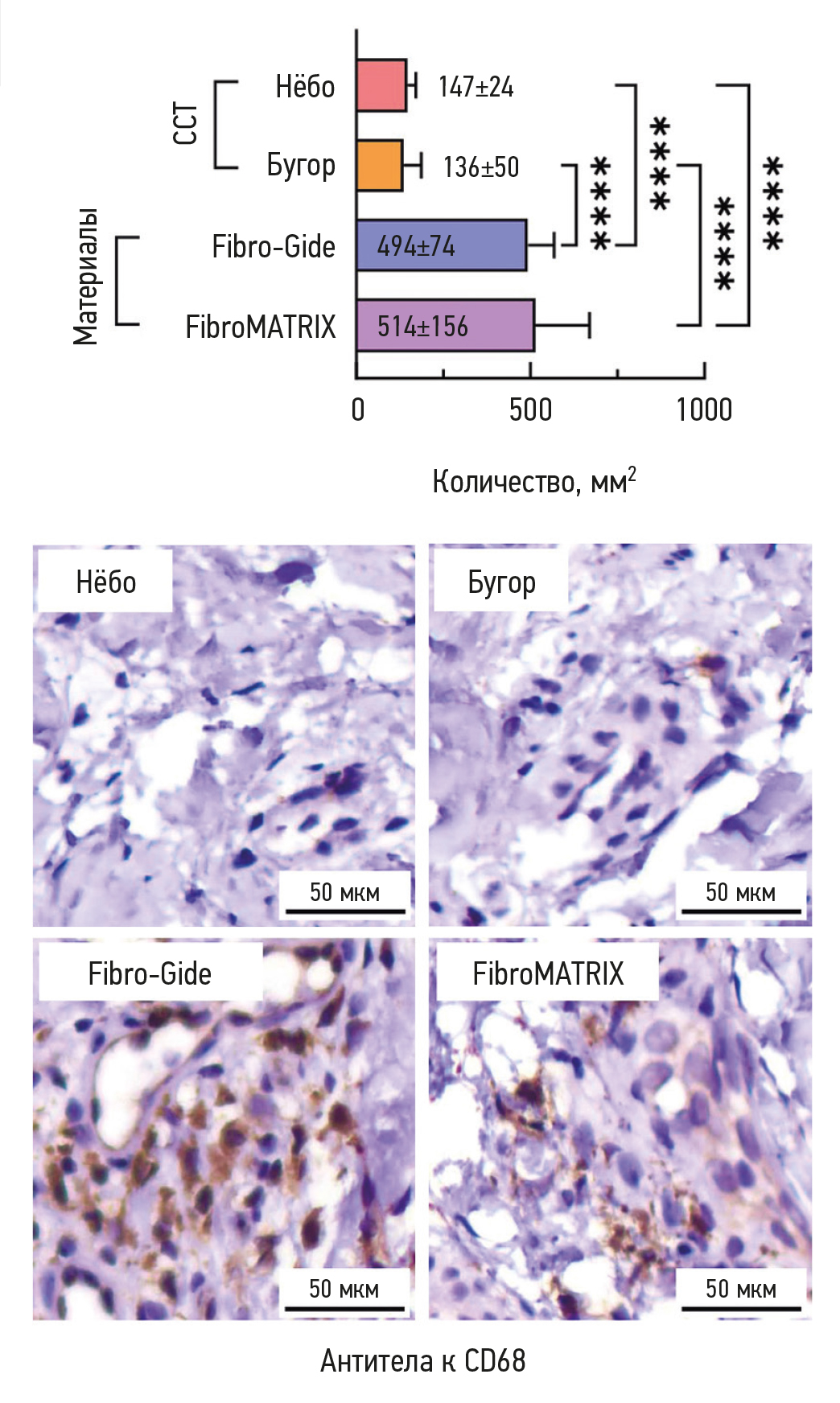 Fig. 6. Histogram of macrophage counts per mm2 in gingival regeneration specimens 3 months after surgery and representative immunohistochemically stained sections immunohistochemically stained with anti-CD68 antibodies; **** p < 0.00001. “Нёбо” is a biopsy section after use of palatal free connective tissue graft; “Бугор” is a biopsy section after use of tuberosity palatal free connective tissue graft; “Fibro-Gide” is a Fibro-Gide collagen matrix biopsy section; “FibroMATRIX” is a FibroMATRIX collagen matrix biopsy section.