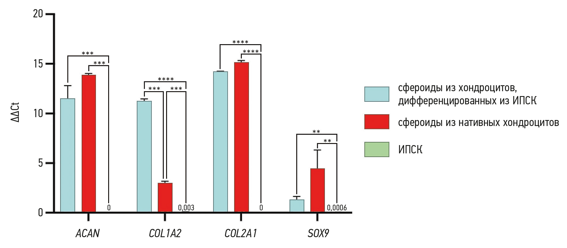 Рис. 5. Результаты анализа относительной нормализованной экспрессии хондроцитарных генов в образцах сфероидов хондроцитов, дифференцированных из индуцированных плюрипотентных стволовых клеток (ИПСК) (1 биологический повтор) и сфероидов нативных хондроцитов (3 биологических повтора). Сфероиды ИПСК (1 биологический повтор) были взяты в качестве отрицательного контроля. Экспрессия хондроцитарных генов ACAN, СOL2A1 и SOX9 значительно выше в сфероидах хондроцитов, дифференцированных из ИПСК, и сфероидах нативных хондроцитов по сравнению с контрольной группой ИПСК. Это указывает на успешную дифференцировку ИПСК в хондроцитарном направлении. Однако в группе сфероидов, которые сформированы из хондроцитов, дифференцированных из ИПСК, наблюдается значительное повышение экспрессии гена COL1A2 по сравнению с группой сфероидов нативных хондроцитов, что свидетельствует о наличии хондроцитов, характерных для волокнистого хряща. На графиках указана статистическая значимость различий по тесту Тьюки: ** p ≤0,01, *** p ≤0,001, **** p ≤0,0001.