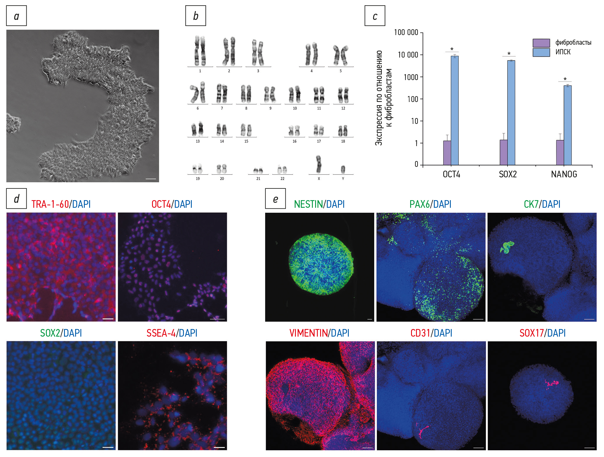 Рис. 1. Характеристика линии ИПСК FCBRNi001-A: a — морфология клеток; b — анализ кариотипа линии ИПСК; c — результаты количественной полимеразной цепной реакции с обратной транскрипцией на маркёры плюрипотентности OCT4, SOX2, NANOG; * статистически значимые различия, p < 0,0001; d — иммуноцитохимическое окрашивание на маркёры плюрипотентности SOX2, OCT4, TRA-1-60 и SSEA-4; окраска ядер: DAPI (синий), исследуемый маркёр (красный или зелёный); е — иммуноцитохимическое окрашивание эмбриоидных телец, сформированных из ИПСК, при спонтанной дифференцировке в ткани трёх зародышевых листков; окраска ядер: DAPI (синий), исследуемый маркёр (красный или зелёный). Маркёры эктодермы — NESTIN, PAX6, CYTOKERATIN 7 (CK7); мезодермы — VIMENTIN, CD31; эндодермы — SOX17. Бар 50 мкм. ИПСК — индуцированные плюрипотентные стволовые клетки.