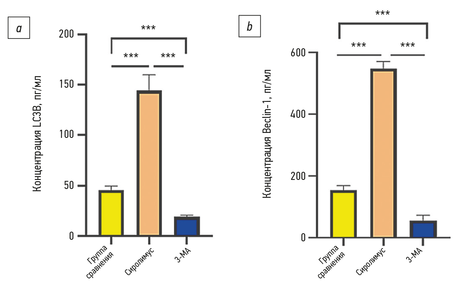 Рис. 2. Концентрация белков аутофагии при культивировании мультипотентных мезенхимальных стромальных клеток (ММСК) в течение 24 ч с модуляторами аутофагии: сиролимусом и 3-метиладенином: a — определение концентрации LC3B в надосадочной жидкости с использованием набора MAP1LC3b (Cloud-Clone, США); b — определение концентрации Beclin-1 в надосадочной жидкости с использованием набора BECN1 (Cloud-Clone, США); *** различия статистически значимы при р < 0,001. Группа сравнения — с трансплантацией ММСК; Сиролимус — ММСК, культивированные с активатором аутофагии сиролимусом в концентрации 3 мкмоль/л; 3-МА — ММСК, культивированные с ингибитором аутофагии 3-метиладенином в концентрации 10 мкмоль/л.