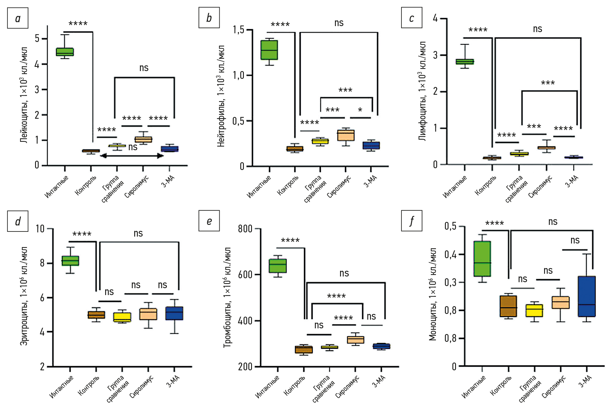 Рис. 5. Содержание форменных элементов крови лабораторных животных на 7-е сутки острой лучевой болезни: a — общее количество клеток лейкоцитов; b — количество клеток нейтрофилов; c — количество клеток лимфоцитов; d — количество эритроцитов; e — количество тромбоцитов; f — количество клеток моноцитов; * различия статистически значимы при р ≤ 0,05; *** различия статистически значимы при р ≤ 0,001; **** различия статистически значимы при р < 0,0001; ns — нет статистически значимых различий. Интактные — группа лабораторных животных, не подвергшихся ионизирующему излучению; Контроль — не проводилась трансплантация клеток; Группа сравнения — с трансплантацией мультипотентных мезенхимальных стромальных клеток (ММСК) без модулирования в них аутофагии; Сиролимус — проведена трансплантация ММСК с активированной в них аутофагией сиролимусом; 3-МА — проведена трансплантация ММСК с ингибированной в них аутофагией 3-метиладенином.