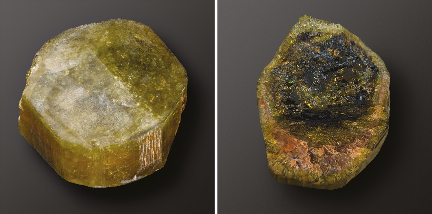 Fig. 1. A crystal fragment of zoned colored tourmaline, view from opposite sides. 3.2 × 3.2 × 2 cm. Krutaya vein, Malkhan pegmatite field. Photo by M.D. Milshina.