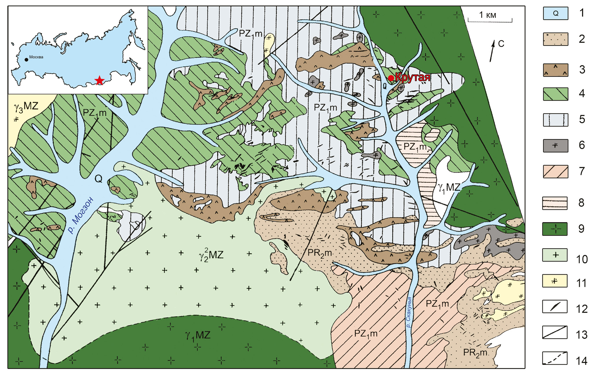 1 – четвертичные отложения (галечники, пески); 2 – нерасчлененная толща метапород малханской серии верхнего протерозоя (PR2m, биотитовые и биотит-амфиболовые сланцы); 3–8 – метаортопороды нижнепалеозойского малханского комплекса (PZ1m): 3 – более основные метагабброиды; 4 – менее основные метагабброиды, метадиориты; 5 – кварцевые метадиориты; 6 – ультраметаморфические биотитовые лейкограниты; 7 – амфибол-биотитовые граниты; 8 – биотитовые гнейсограниты, аплитовидные граниты; 9–11 – мезозойские граниты (MZ): 9 – биотитовые порфировидные граниты γ1; 10 – двуслюдяные лейкограниты γ22; 11 – жильные биотитовые двуслюдяные граниты, аплиты γ3; 12 – пегматитовые жилы (жила Крутая обозначена красной точкой); 13 – тектонические нарушения; 14 – фациальные границы.