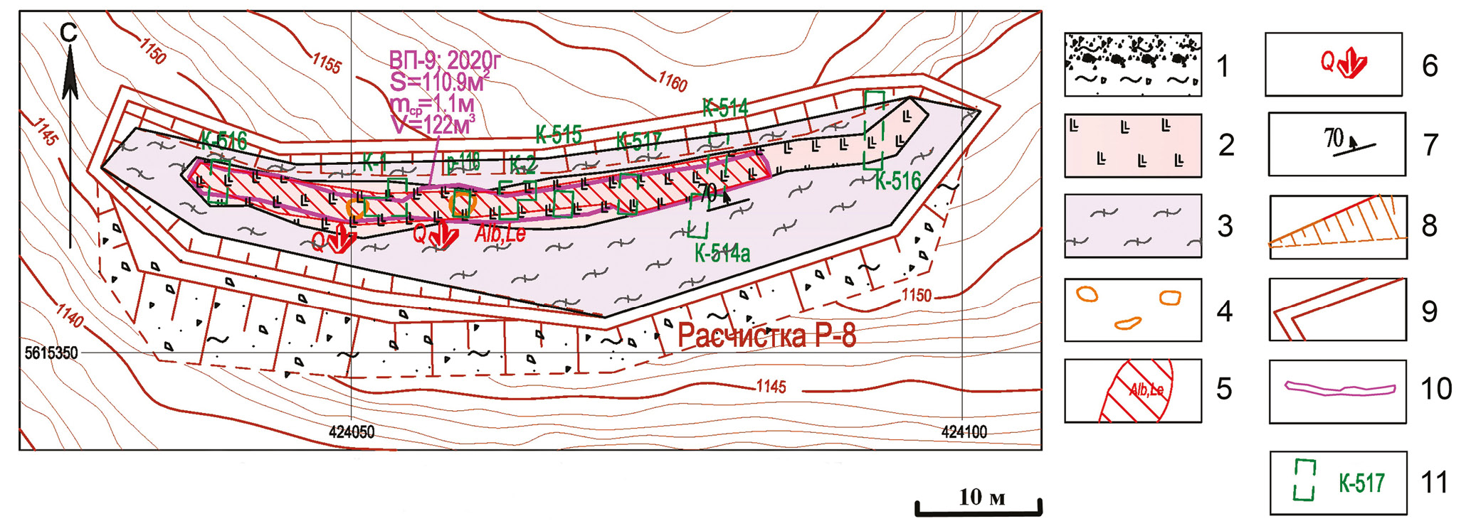 1 – technogenic ground; 2 – microcline pegmatite; 3 – biotite-amphibole and amphibole gneisse, amphibolite; 4 – miaroles; 5 – area of albite-lepidolite-tourmaline mineral complex; 6 – places of finding of quartz crystals and druses; 7 – inclined occurrence of pegmatite vein contacts; 8 – clearing dump; 9 – clearing contours; 10 – sampling place of the studied tourmaline crystal (the sample number, year of sampling, area, average thickness and volume are indicated); 11 – trenches of 1983–1987 by Geological Expedition Baikalquartzsamotsvety.