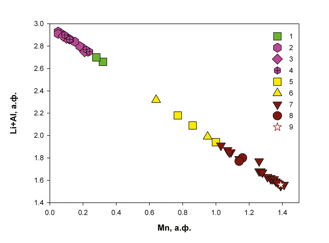 Рис. 6. Соотношение между Mn и Li + Al в позиции Y минералов надгруппы турмалина из жилы Крутая.