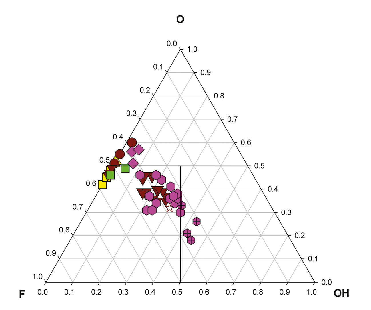 Рис. 7. Соотношение анионов, занимающих позицию W в минералах надгруппы турмалина из жилы Крутая.