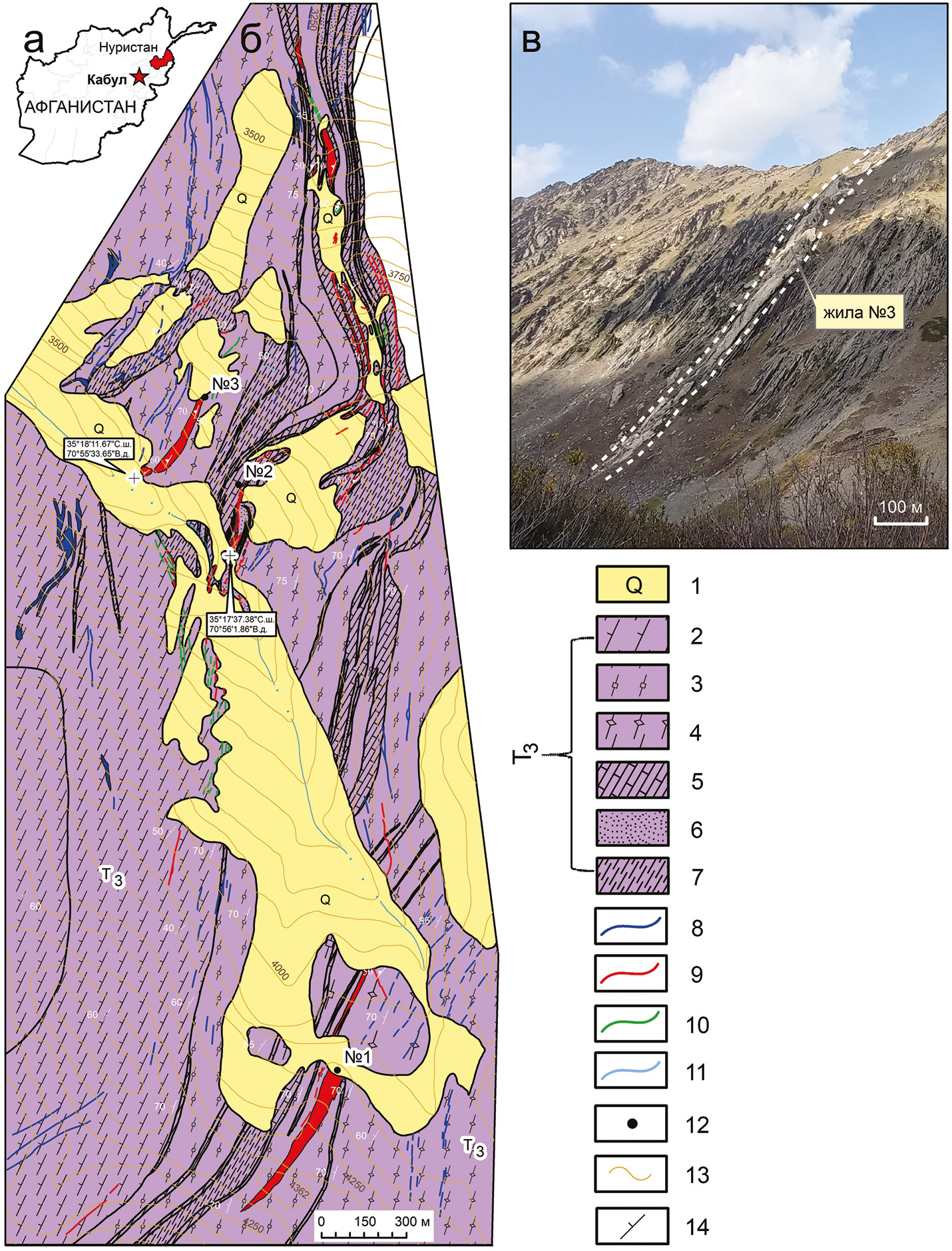 Fig. 1. Position of the Nuristan province in Afghanistan (а), geological scheme of the Pashki deposit with geographical coordinates of the upper parts of veins nos. 2 and 3 (б) (composed by B.Ya. Vihter and G.K. Eremenko in 1973 and digitized by N. Hamdard in 2024), and a photo of vein no. 3 (в). 1 – Talus, proluvial, colluvial, and fluvioglacial rocks; 2–4 – schists: 2 – biotite-amphibole, biotite; 3 – garnet-muscovite-biotite; 4 – garnet-staurolite-muscovite; 5 – limestone, marblized limestones; 6 – sandstones, calcareous sandstones; 7 – phyllites, phyllitized siltstones; 8–10 – pegmatites: 8 – albitized microcline; 9 – spodumene-microcline-albite; 10 – intensely albitized with pollucite; 12 – numbers of main spodumene-bearing veins; 13 – isohypses with height above sea level; 14 – bedding elements (with dip angles).