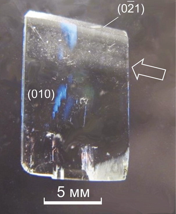 Рис. 2. Полированная пластинка сподумена, вырезанная из кристалла параллельно (100), с чередованием бесцветных и замутненных флюидными включениями зонами роста (показаны стрелкой) в пирамиде роста грани призмы (021) (образец № 1).