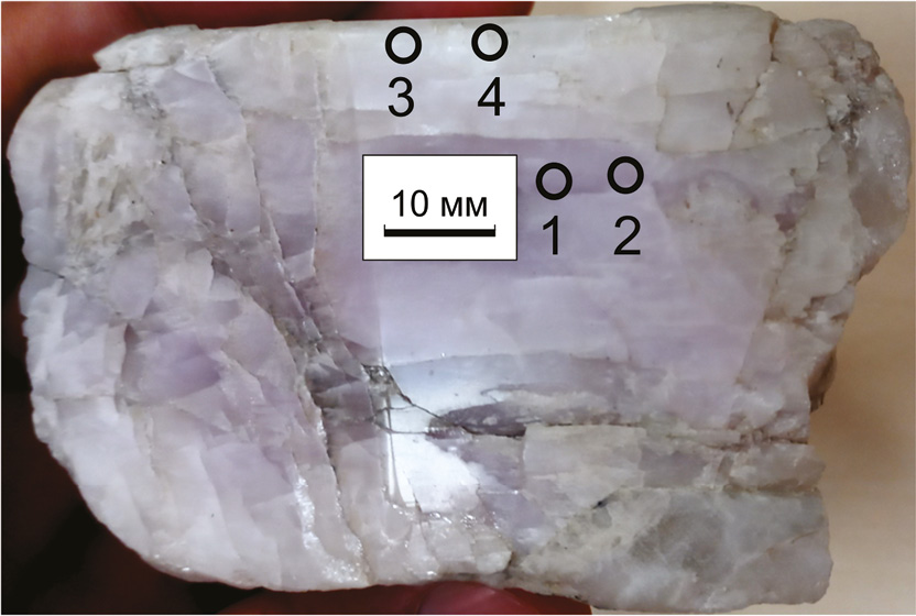 Рис. 4. Кристалл сподумена из кварцевого ядра пегматита с указанием точек анализа (обр. № 2). 1–4 – Сподумен: 1, 2 – фиолетовый; 3, 4 – белый с зеленым оттенком в пирамиде роста грани пинакоида (010) (табл. 2).