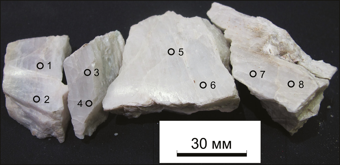 Рис. 5. Обломки кристалла сподумена из пегматита блоковой структуры с указанием точек анализа (обр. № 3). 1–8 – Сподумен: 1, 2, 3, 4 – фиолетовый; 5, 6, 7, 8 – белый с зеленоватым оттенком (табл. 3).