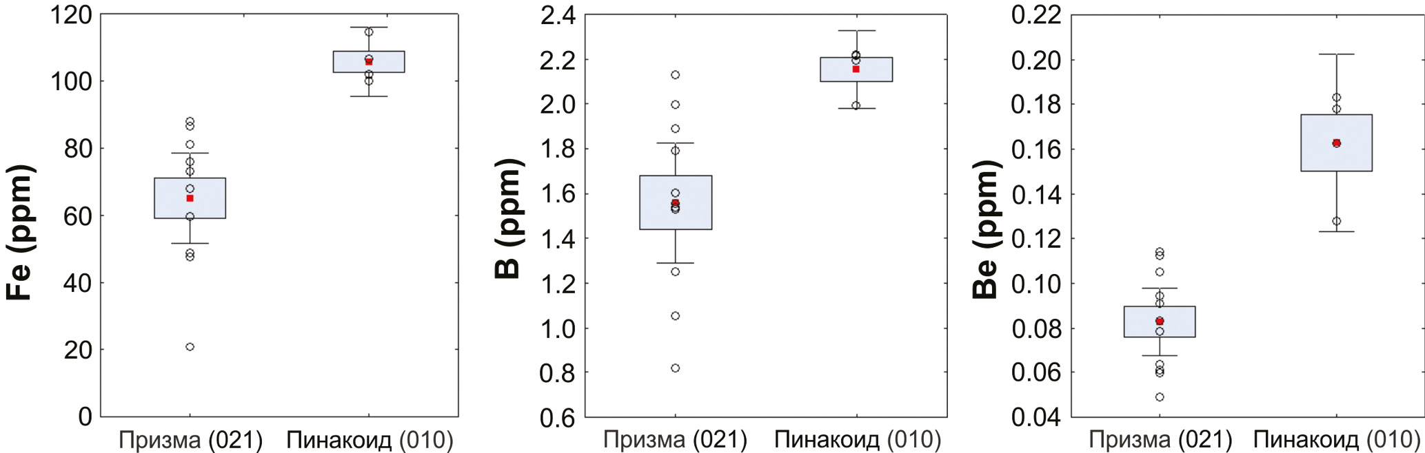 Fig. 6. Box-and-whisker diagrams for Fe, Be, and B content of the spodumene crystal in the growth pyramids of faces of different simple forms (Table 1). Here and in Fig. 7: red spot – mean content; grey rectangle – mean content ± standard error; «whiskers» – mean content ± 0.95 × confidence interval; circles – initial data.