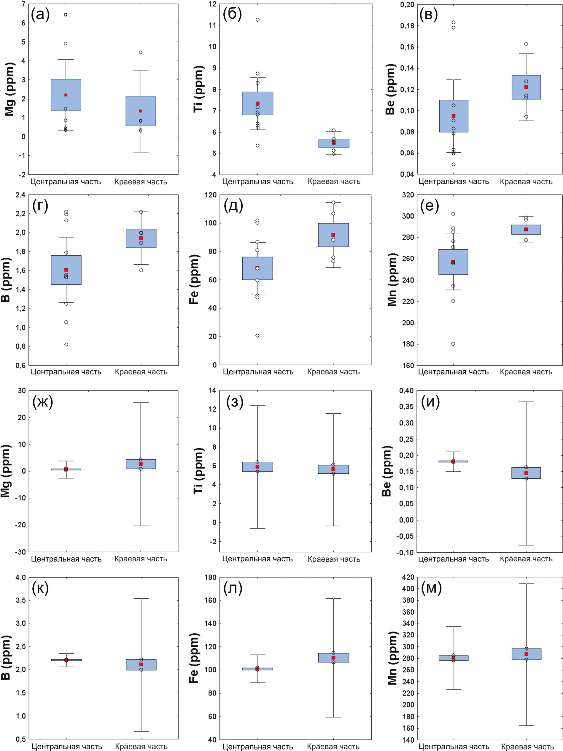 Fig. 7. Box-and-whisker diagrams for Mg, Ti, Be, B, Fe, and Mn contents of spodumene crystal (sample no. 1) in the central and marginal parts of the growth pyramids of the following habitus faces: a–f – prism (021); g–m – pinacoid (010).