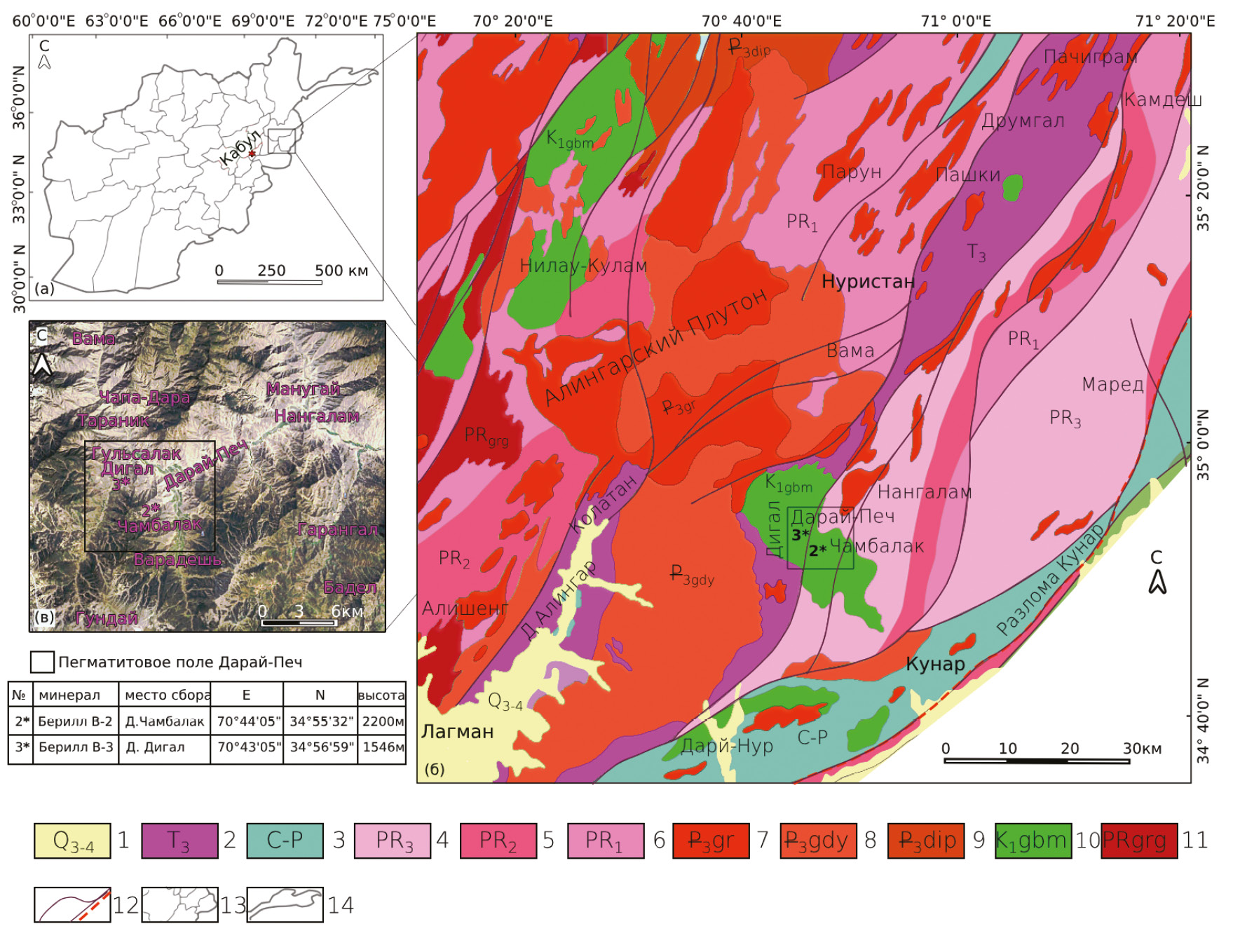 Fig. 1. Area of studies: a – general position of the Nuristan tectonic zone in Afghanistan; б – geological map of the central part of the pegmatite belt of Eastern Afghanistan, composed using materials (Rossovskiy, Chmyrev, 1977; Doebrich et al., 2006; Mosazai et al., 2017); в – satellite image of the Darai Pech pegmatite field and the position of the Chambalak (2) and Digal (3) deposits.