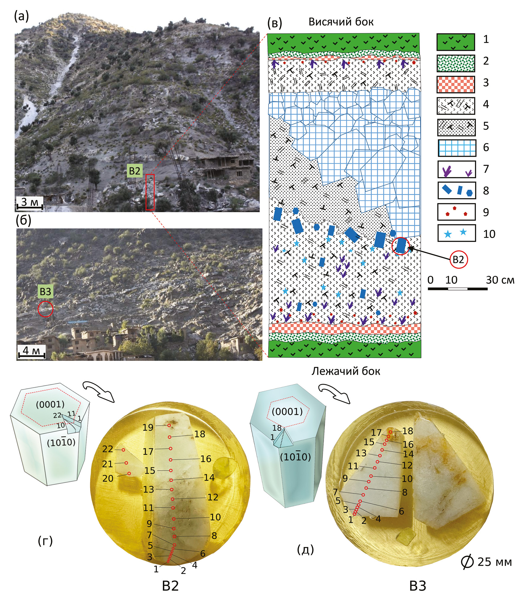 Fig. 2. General view of location and structure of pegmatite veins with position of the studied beryl crystals and analytical points (compiled by A. Yosufzai): a – Chambalak deposit; б – Digal deposit; в – internal structure of microcline-albite pegmatite veins of the Chambalak deposit; г – sample B2, Chambalak deposit; д – sample B3, Digal deposit.