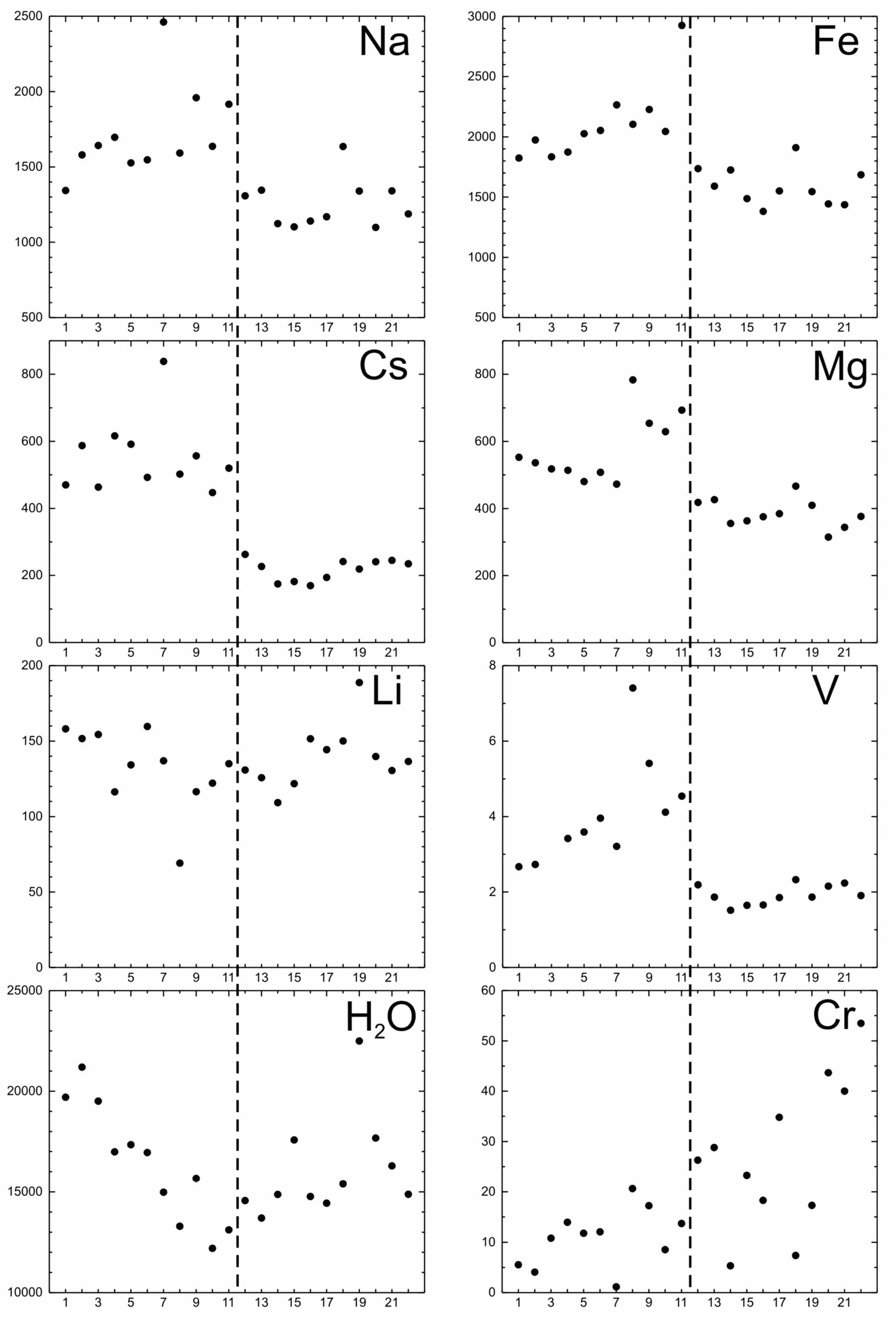 Помимо крупноионных литофильных элементов в каналы кристаллической структуры берилла могут входить молекулы H2O, а также галогены (Cl и F) и В. Измеренное содержание H2O составляет в среднем 16255 г/т. В центральной части кристалла (не учитывая точку 19) содержание H2O незакономерно варьирует от 13699 до 17674 г/т, составляя в среднем 15418 г/т. В краевой части содержание H2O монотонно увеличивается (от 12195 до 21194 г/т, в среднем 16448 г/т), достигая максимума в краю кристалла. Переход в содержании H2O между центральной и краевой частями кристалла плавный, а не скачкообразный.