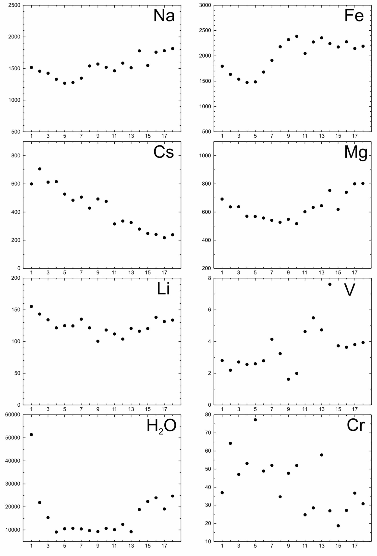 Крупноионные литофильные элементы. Содержание Na ступенчато понижается по профилю от 1815 г/т в точке 18 до 1267 г/т в точке 5 и потом повышается к краю (1517 г/т в точке 1). Содержание K варьирует в широком диапазоне: от 110 до 7632 г/т при среднем содержании 2547 г/т. В самом краю кристалла (точки 3–1) оно систематически падает. Содержания Cs демонстрируют закономерное увеличение от начала профиля в центральной части (точка 18 – 239 г/т) до края кристалла (706 г/т в точке 2 и 600 г/т в точке 1). Между точками 10 и 11 наблюдается разрыв в едином распределении.