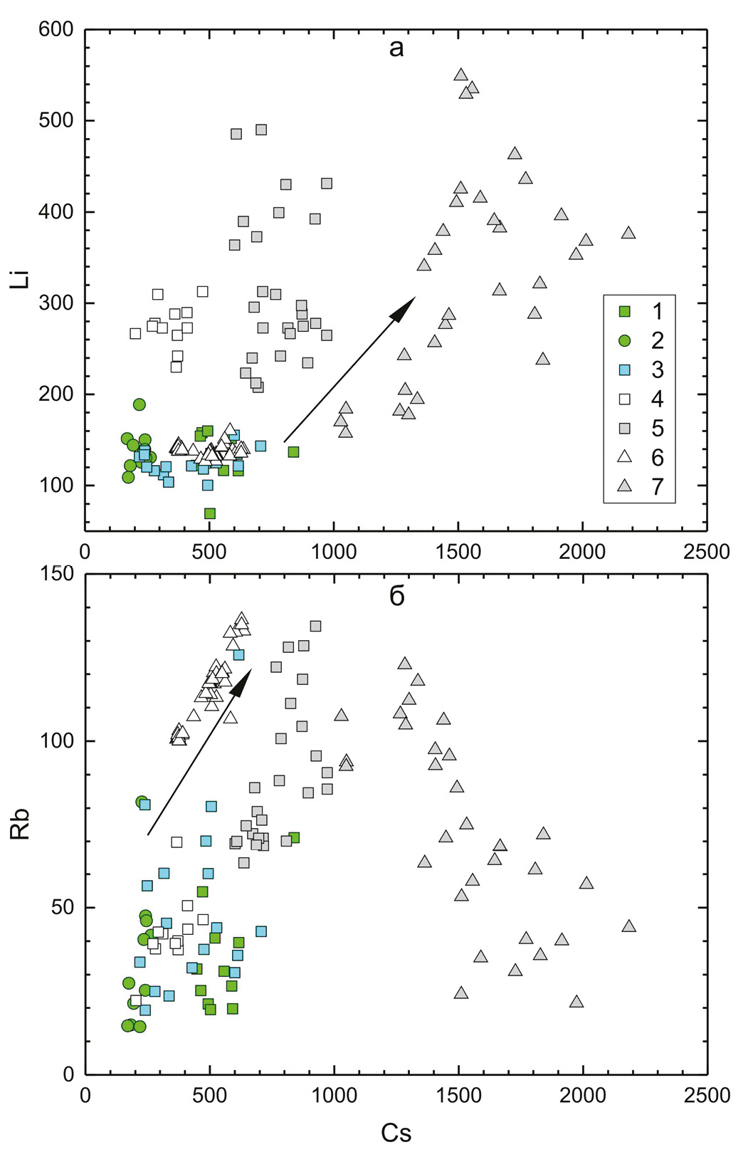 Рис. 5. Соотношение содержания (г/т) Cs c Li (а) и Rb (б) для берилла из пегматитовых месторождений провинции Кунар (1, 2 – точки, относящиеся к секторам роста призмы и пинакоида, соответственно, обр. В2, месторождение Чамбалак; 3 – точки, относящиеся к секторам роста призмы, обр. В3, месторождение Дигал), пегматитов месторождения Шихюао, Китай (4 – из пегматитов промежуточной зоны; 5 – из пегматитов верхней зоны; Duan et al., 2024) и пегматитов месторождения Калифорния Блю Майн, США (6 – ранняя магматическая генерация; 7 – поздняя метасоматическая генерация; Pauly et al., 2021). Тренд фракционирования показан согласно (Duan et al., 2024).