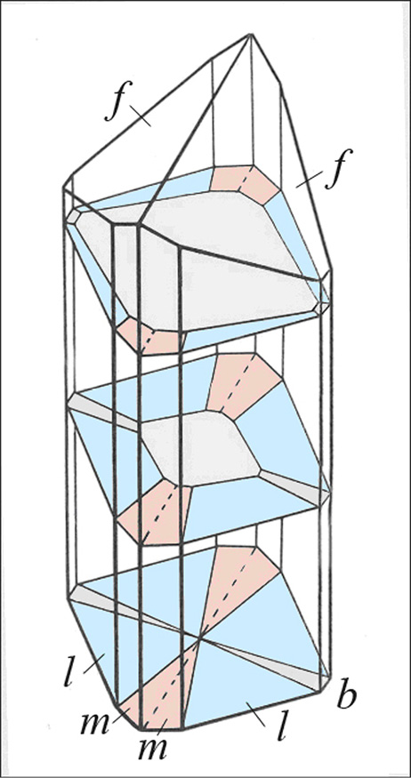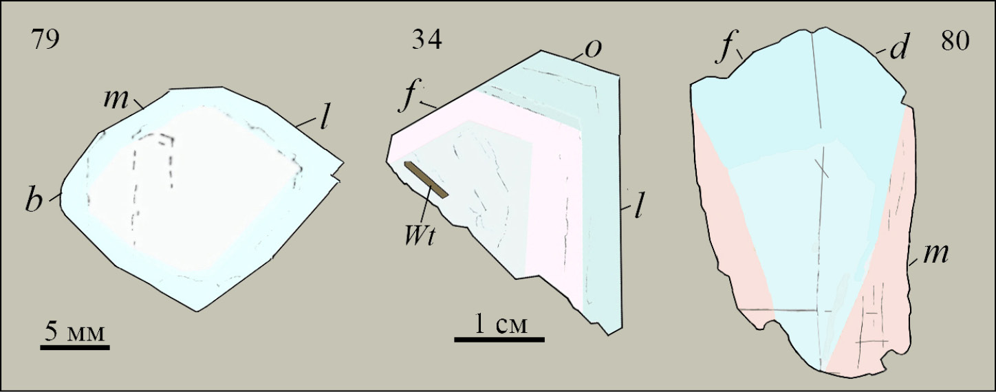 Наиболее привлекательны зональные и зонально-секториальные полихромные кристаллы. Один из примеров окраски разных пирамид роста по трем сечениям топаза Волыни (рис. 3) – голубой призмы l{120}, розовой призмы m{110} и бесцветных пинакоида b{010} и призмы f{011} – приведен ранее (Леммлейн, Меланхолин, 1951; цвет дан нами). В другом кристалле топаза пирамида роста пинакоида b{010} – розовая, призмы l{120} – голубая (Леммлейн, 1948). Ранее указывалось (Бершов, 1970, Платонов, 1976 и др.), что предцентры окраски волынских топазов имеют радиационную природу с образованием комплексов [Ti׀–O4F2] в голубых топазах и зонах, а комплексов [Ti׀׀–O4(OH,F)2] и [Ti׀׀׀–O4(OH)2] – в розовых топазах. Отмечалось также, что химический состав голубых и розовых топазов мало отличается, в основном, по содержанию фтора (Платонов и др., 1984).
