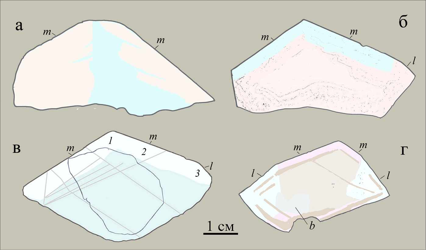 Нами исследованы топазы в пластинках размером 4–6 см и толщиной ~1 см в срезе ║(001), переданные К. Клопотовым в 1982 г. (отобранные, вероятно, из разных жил или полостей). Пластинки топазов прозрачные, с участками граней ромбических призм m{110}, l{120} и розоватыми, голубоватыми, коричневатыми и бесцветными зонами и секторами. В одних кристаллах периферические зоны призмы m – розоватые, в других – голубоватые или бесцветные, а зоны призмы l – розоватые или бесцветные (рис. 4).
