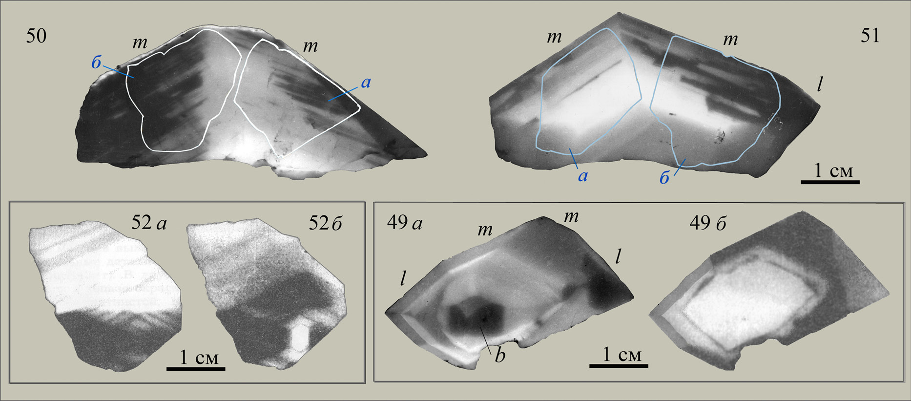 После трех минут облучения реакторными нейтронами окраска топазов стала более интенсивной: розовые участки приобрели красный или фиолетово-красный цвет, голубоватые – ярко-голубой, а первично бесцветные – голубоватый. Зональность и секториальность топазов контрастно проявлена на фото последовательных радиографий (рис. 5), где наиболее активны светлые участки и зоны (исходный препарат № 52 позднее был обколот для анализов относительно формы образца на рис. 4в). Условия выполнения радиографий препаратов топаза: № 50 – τ 5 сут., tэ 6 ч.; № 51 – τ 15 мин., tэ 30 с.; № 52а – τ 17 мин., tэ 15 с.; № 52б – τ 14 мес., t 1.5 мес.; № 49а – τ 1 ч., tэ 1.5 мин.; № 49б – τ 5 суток, tэ 6 ч.