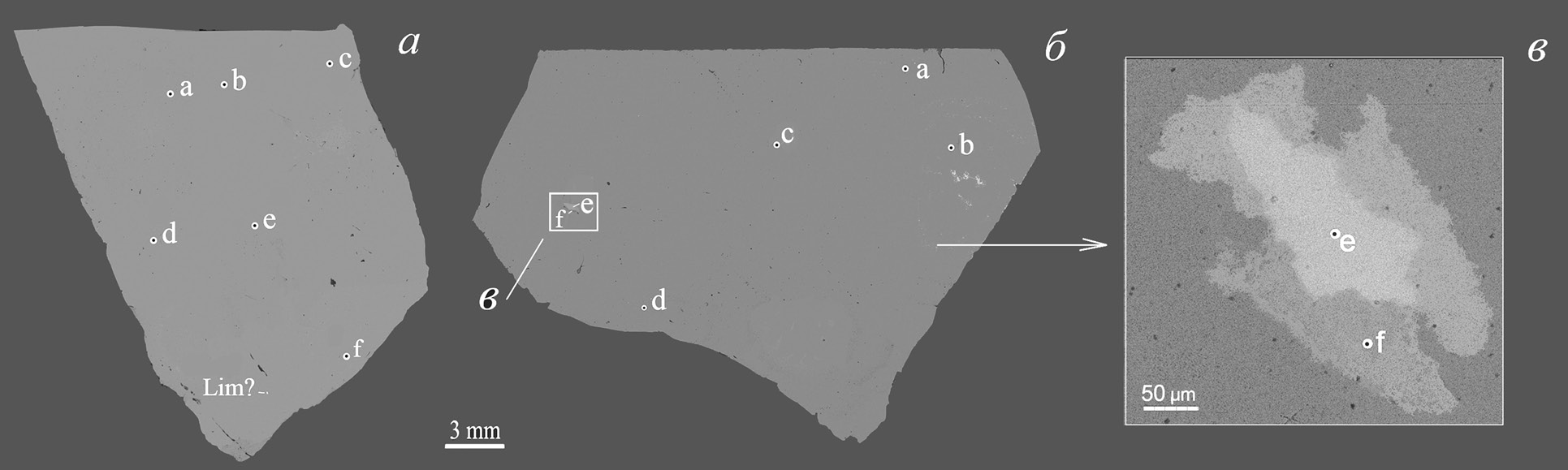 Топазы из копей №№ 87 и 411 (рис. 9б, в) после облучения нейтронами приобрели зонально-секториальную неоднородность. Химический состав участков (рис. 10) немного отличается (мас. %): SiO2 31.59–32.05, Al2O3 56.39–56.93, F 11.44–13.29. Эмпирические формулы топаза № 141 из копи № 87 (рис. 9а): a – Al2.09[SiO4]F1.16(OH)1.11, b – Al2.07[SiO4]F1.31(OH)0.90, c – Al2.12[SiO4]F1.32(OH)1.04. В топазе выявлены микровключения торита d – (Th0.66Ce0.18La0.05Nd0.05Ca0.03Pr0.01)0.98[SiO4]0.65[PO4]0.35 и шерла e – Na1.06(Fe2.83Mn0.13Zn0.07Ti0.06)3.09Al6(BO3)3(Si5.97Al0.03 O18)(OH)4.
