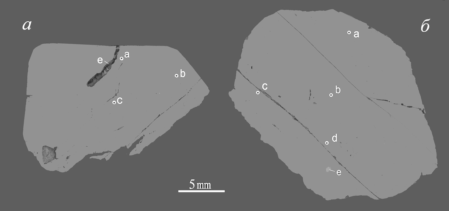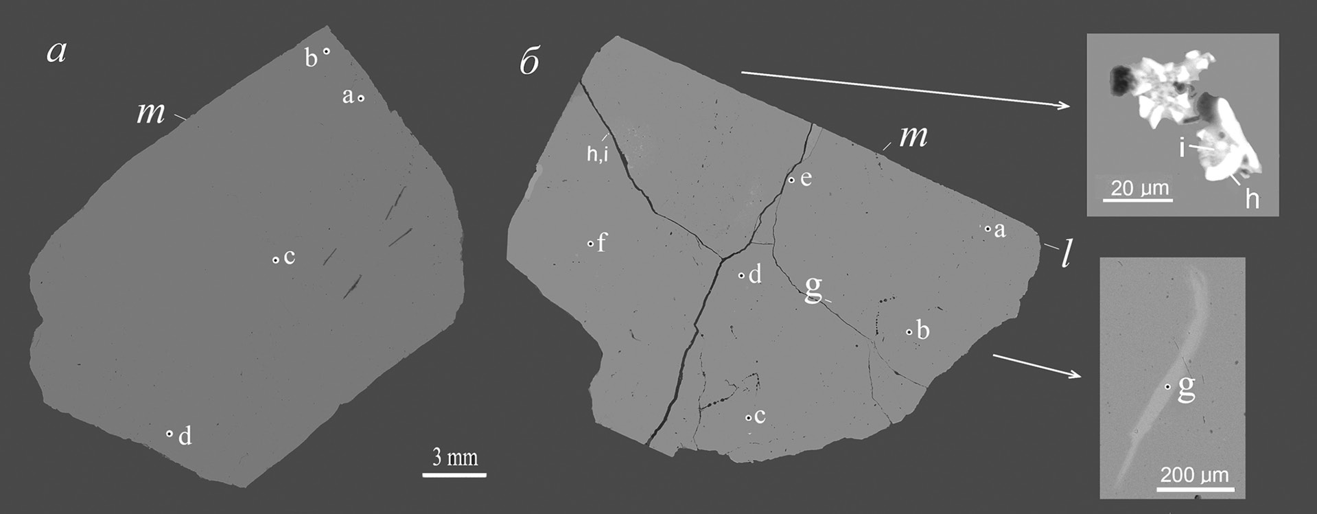 Fig. 10. BSE image of fragments of topaz crystals no. 141 (а) and no. 58 (б) from granite pegmatites of the Ilmeny State Reserve.