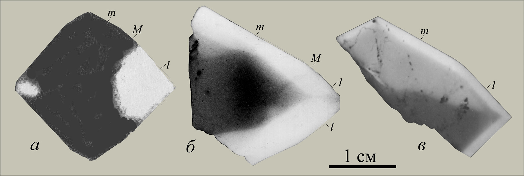 Рис. 9. Результат радиографии фрагментов секториальных и зонально-секториальных кристаллов топаза из копей №№ 50 (а), 87 (б) и 411(в).