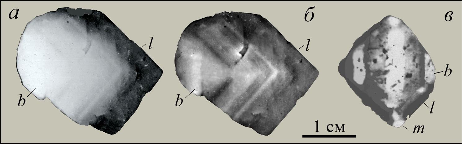 Fig. 11. Result of radiography of fragments of topaz crystals nos. 136 (а), 138 (б), and 139 (в) from the Orlovskoe deposit.